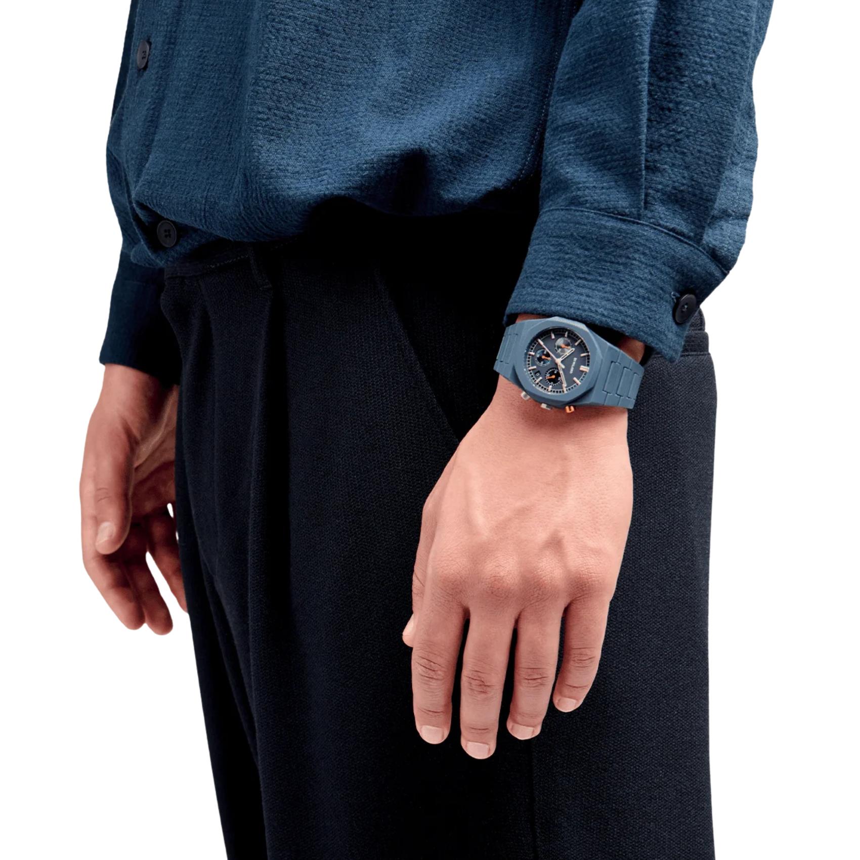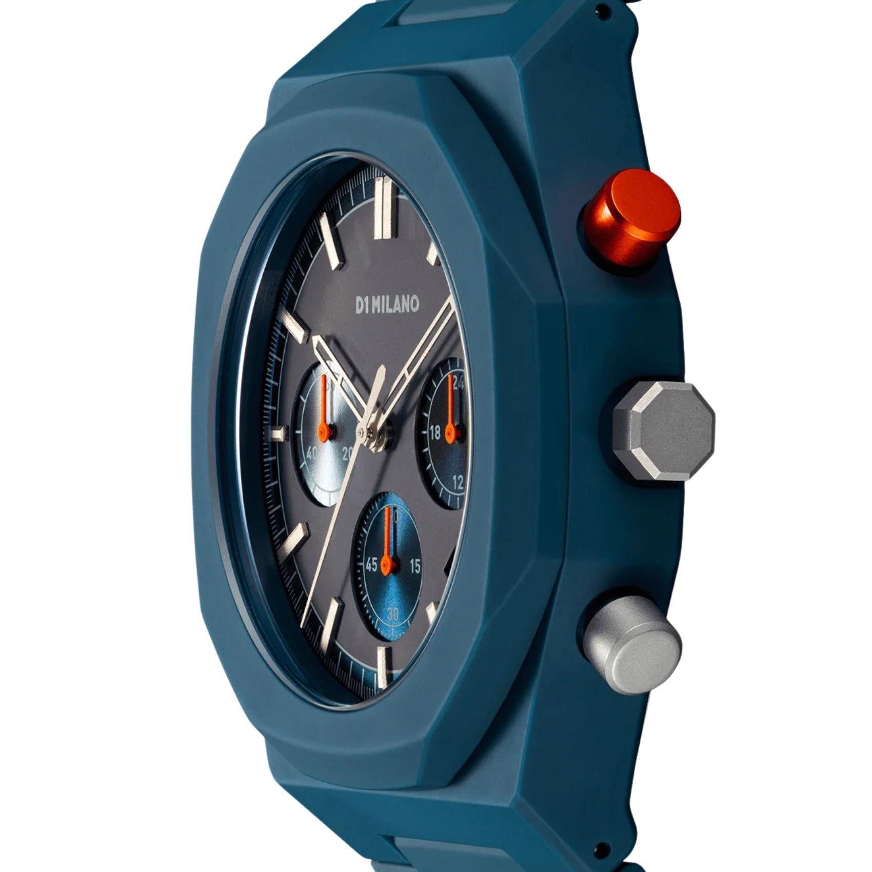 Ρολόι D1 Milano Polychrono Blue D1-PHBJ09 με μπλε πολυκαρμπονικό μπρασελέ soft-touch και ματ μπλε καντράν διαμέτρου 40.5 mm με χρονογράφο και ένδειξη ημερομηνίας. Η κάσα είναι κατασκευασμένη από πολυκαρμπονικό, λειτουργεί με μηχανισμό Seiko SII VD53C Quartz και έχει τζάμάκι από ορυκτό κρύσταλλο ειδικής σκλήρυνσης.Είναι αδιάβροχο στα 50 M / 5 ATM, κατάλληλο για κολύμβηση.