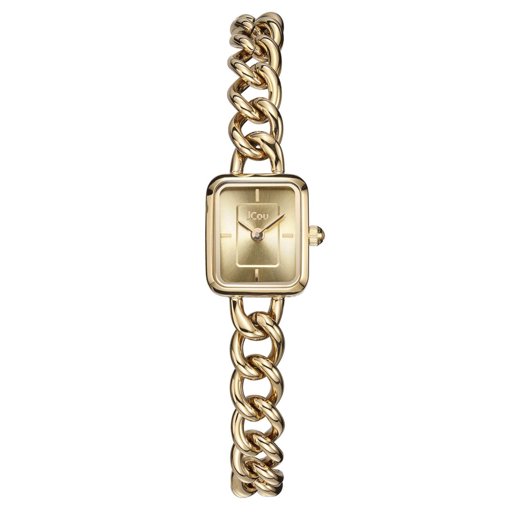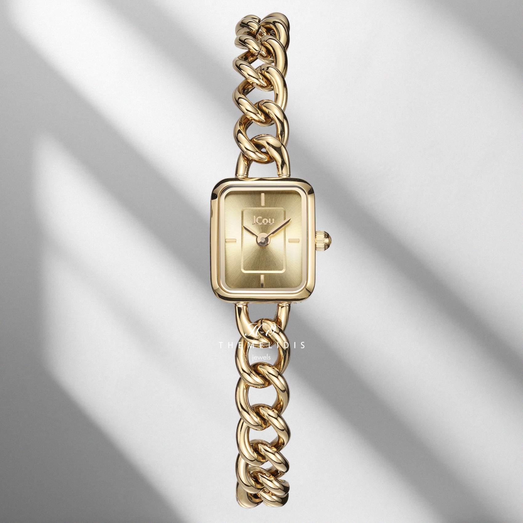 Γυναικείο ρολόι JCOU Lyra JU19084-3 με χρυσό ατσάλινο μπρασελέ σε σχέδιο αλυσίδας και χρυσό καντράν σε τετράγωνο σχήμα διαστάσεων 15mmx15mm. Λειτουργεί με μηχανισμό μπαταρίας quartz, έχει κρύσταλλο από ορυκτό ειδικής σκλήρυνσης και στεγανότητα στα 30M/3ΑΤΜ που το καθιστά κατάλληλο για επαφή με το νερό.