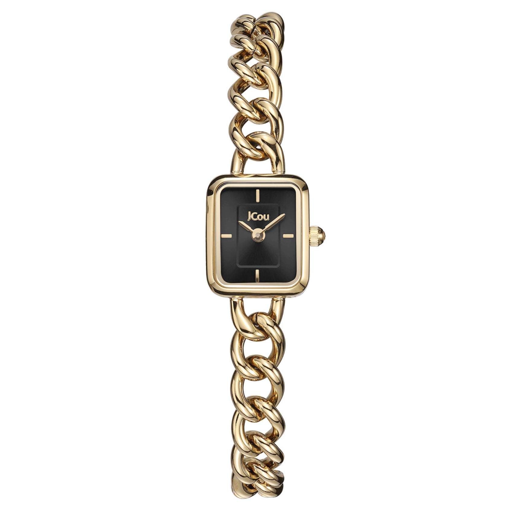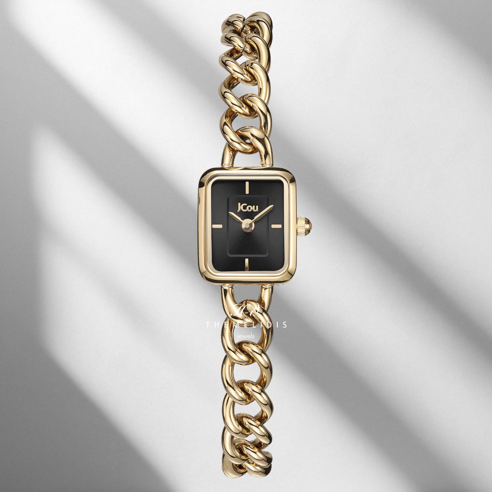 Γυναικείο ρολόι JCOU Lyra JU19084-5 με χρυσό ατσάλινο μπρασελέ σε σχέδιο αλυσίδας και μαύρο καντράν σε τετράγωνο σχήμα διαστάσεων 15mmx15mm. Λειτουργεί με μηχανισμό μπαταρίας quartz, έχει κρύσταλλο από ορυκτό ειδικής σκλήρυνσης και στεγανότητα στα 30M/3ΑΤΜ που το καθιστά κατάλληλο για επαφή με το νερό.