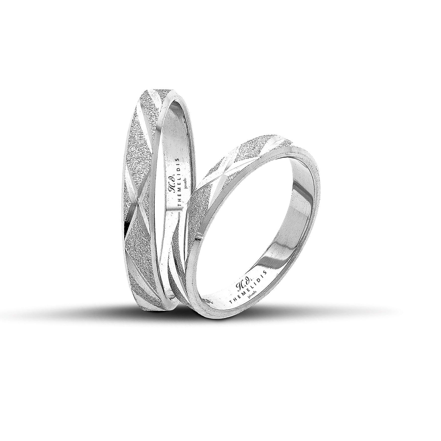 Ένα ζευγάρι μοντέρνες βέρες γάμου λευκόχρυσες κατασκευασμένες χειροποίητα για διαχρονική αντοχή. Οι βέρες έχουν φινίρισμα από αμμοβολή που συνδυάζεται από ένα μοτίβο διαγώνιων γραμμών που σχηματίζουν ένα επανλαμβανόμενο "X" περιμετρικά στην βέρα και κοφτό τελείωμα στις άκρες που αναδυκνύουν την ματ επιφάνεια, συνολικού πλάτους 3.5mm. Διαθέτουν ανατομικό σχεδιασμό για επιπλέον άνεση όταν φορεθεί στο δάχτυλο σας.