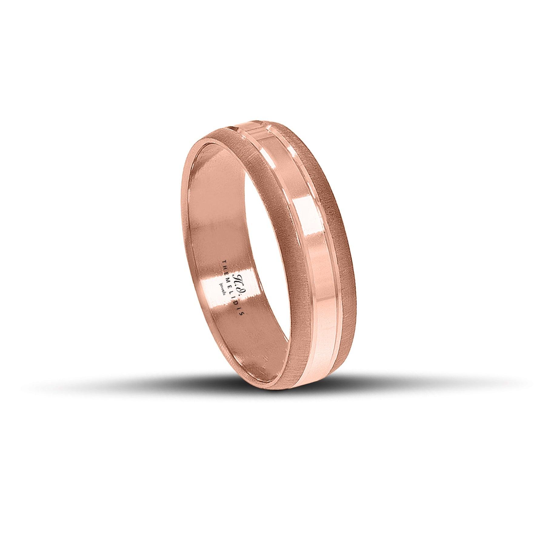 Οι μοντέρνες βέρες γάμου από ροζ χρυσό αποτελούν μία εκλεπτυσμένη επιλογή που συνδυάζει το ματ φινίρισμα με μια κομψή λουστρέ γραμμή στο κέντρο. Η αντίθεση ανάμεσα στη ματ και στη γυαλιστερή επιφάνεια δημιουργεί μια διακριτική λάμψη που αναδεικνύει τη ζεστασιά του ροζ χρυσού. Με πλάτος 6 mm, οι βέρες αυτές προσφέρουν ισορροπία ανάμεσα στη δυναμική παρουσία και τη διακριτική κομψότητα.