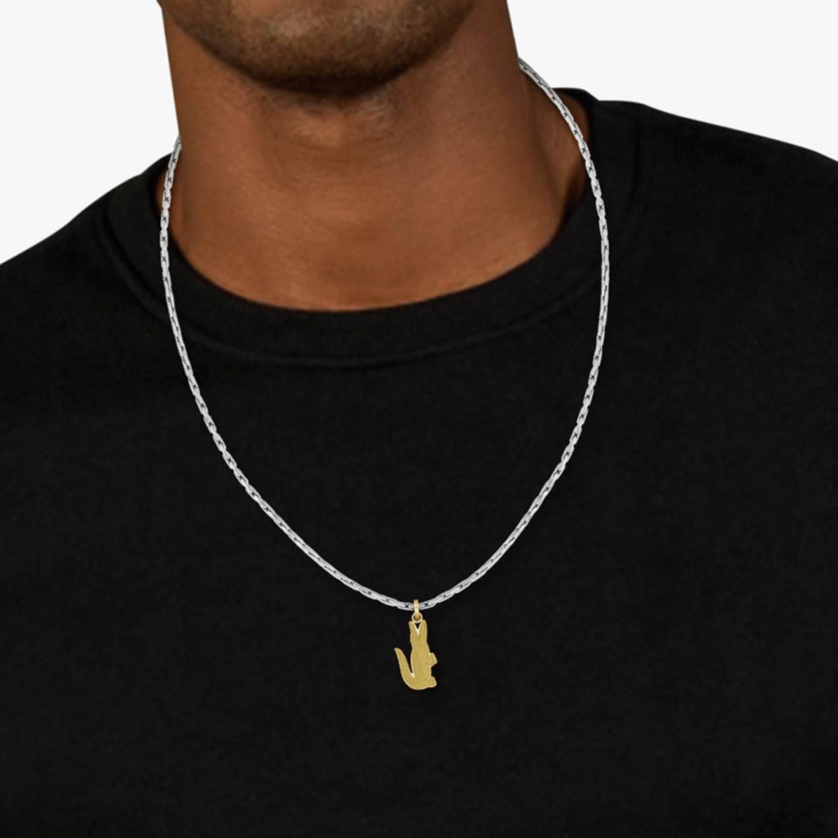 Ανδρικό κολιέ Lacoste 2040551 σε ασημί χρώμα κατασκευασμένο από ανοξείδωτο ατσάλι με χρυσό κρεμαστό στοιχείο. Το μήκος του κολιέ είναι στα 55cm και αποστέλλεται σε συσκευασία δώρου, με πιστοποιητικό γνησιότητας από την επίσημη αντιπροσωπεία της Lacoste.