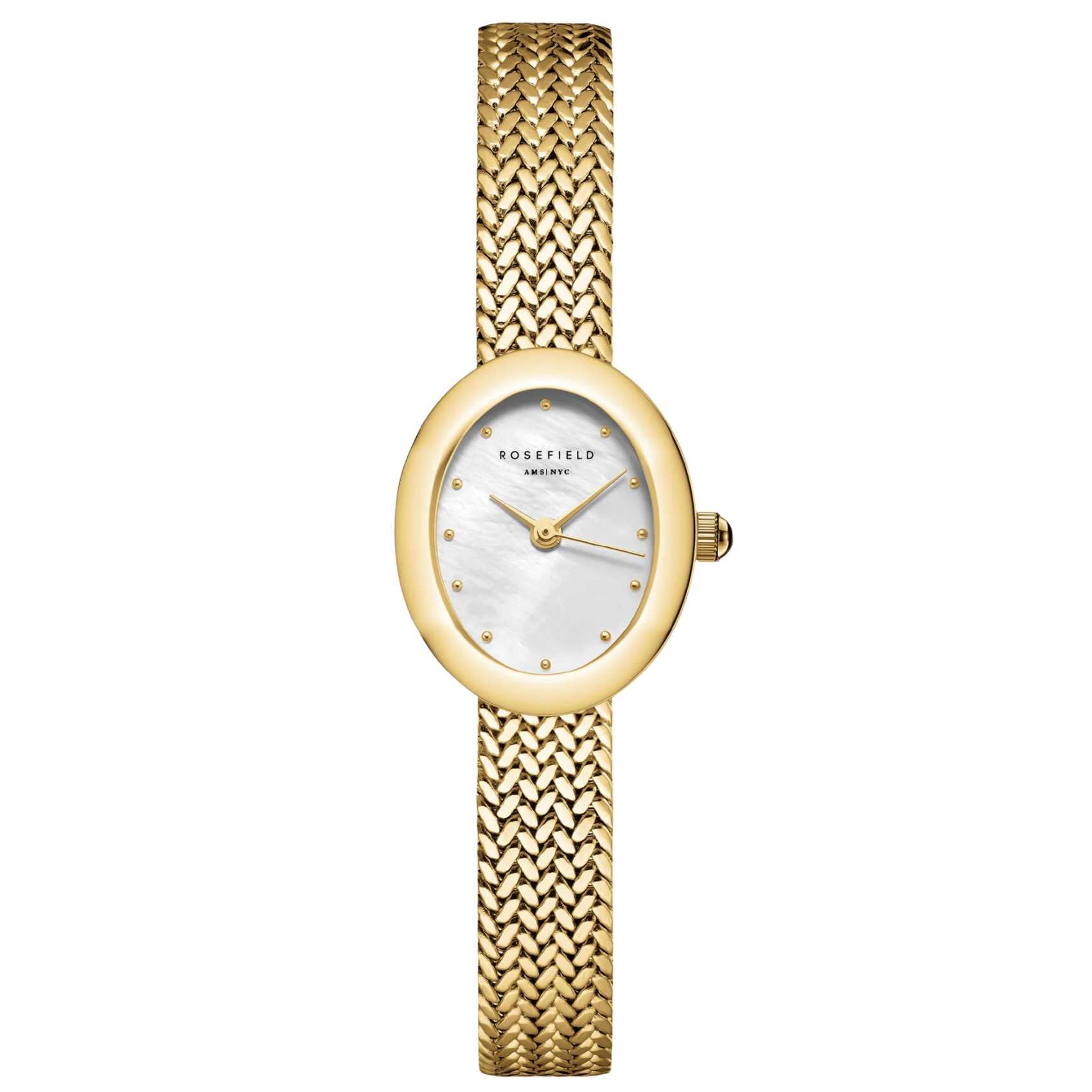Γυναικείο ρολόι Rosefield Mini Oval Gold MWGMG-M02 με χρυσό ατσάλινο μπρασελέ και άσπρο φίλντισι καντράν σε οβάλ σχήμα μεγέθους 18mmX22mm. Έχει τζάμάκι από ορυκτό κρύσταλλο ειδικής σκλήρυνσης, λειτουργεί με μηχανισμό μπαταρίας ενώ έχει στεγανότητα στα 30M/3ΑΤΜ που το καθιστά κατάλληλο για απλή επαφή με το νερό.