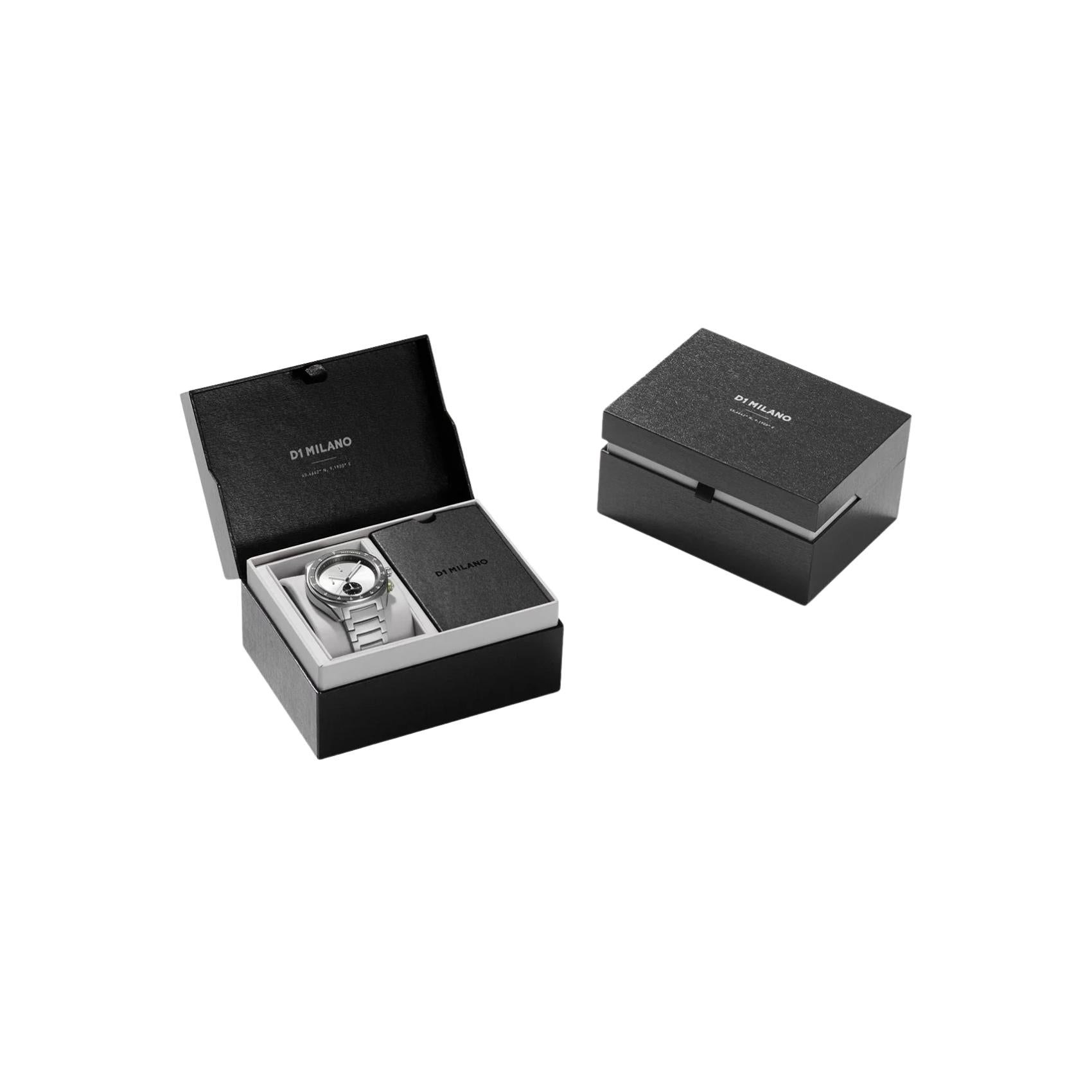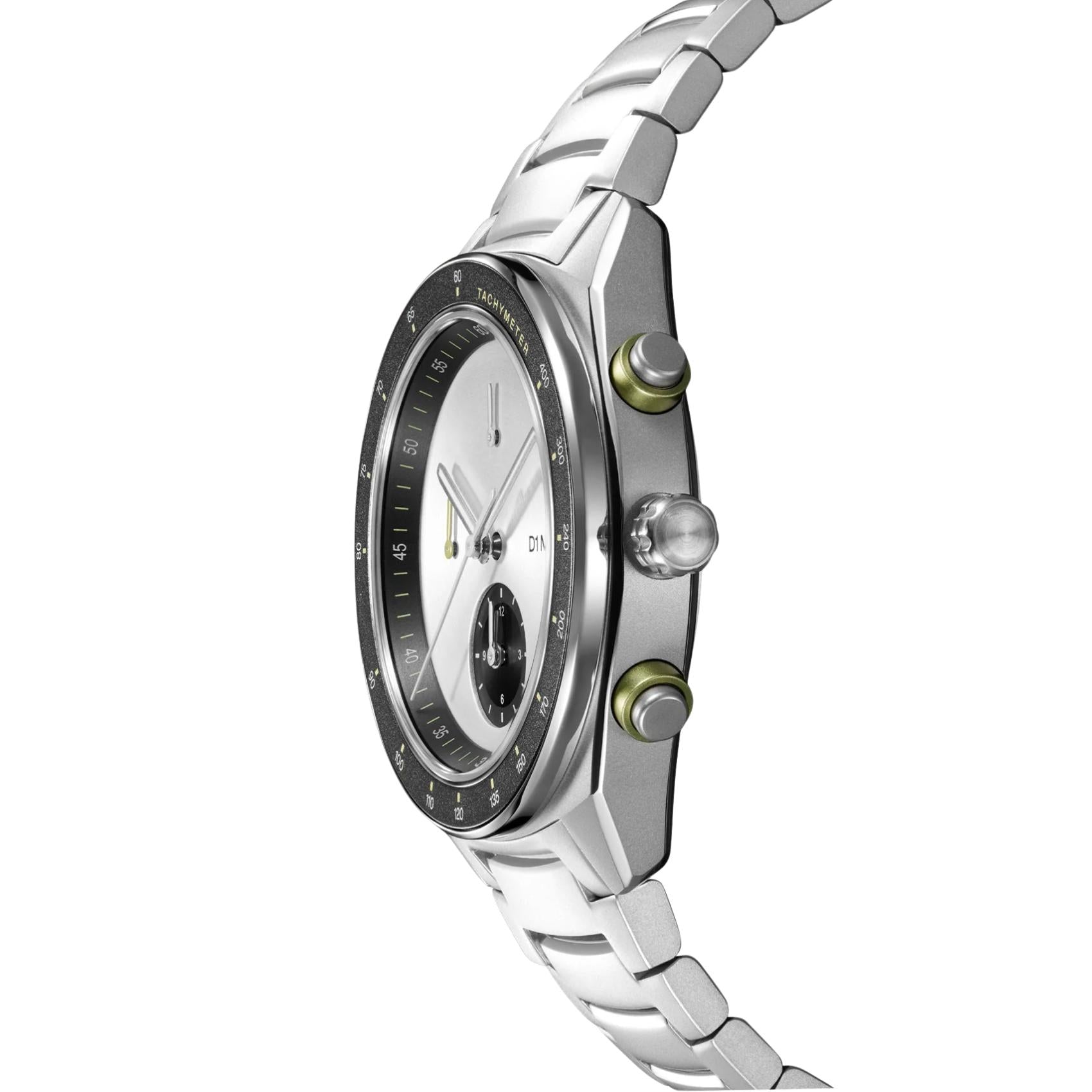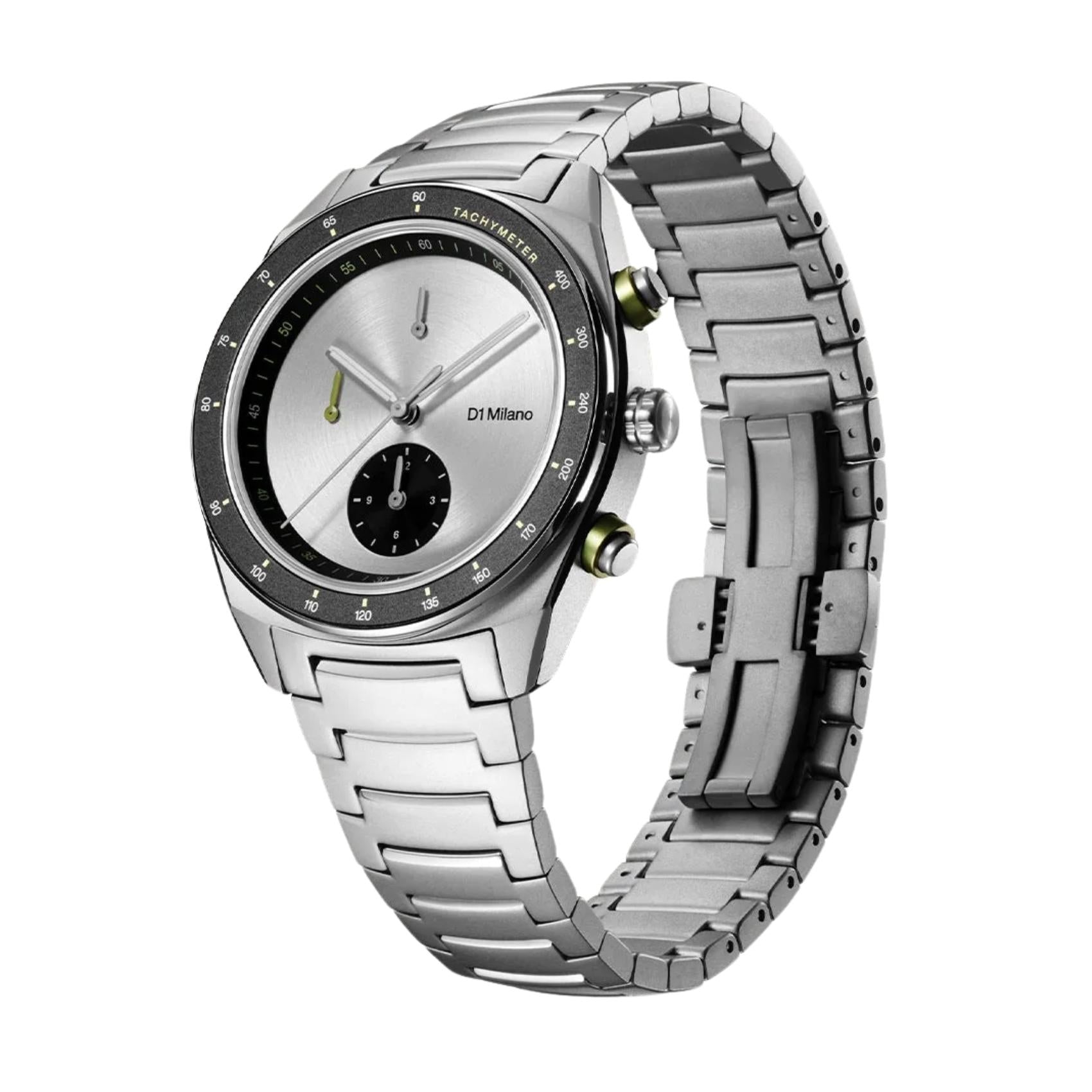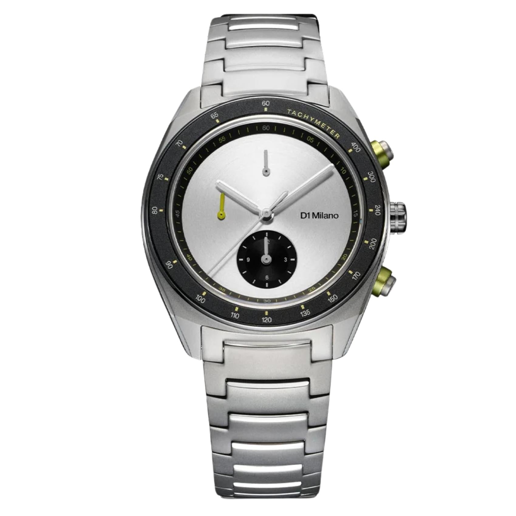 Ανδρικό Ρολόι D1 Milano Essential White D1-CHBJ20 χρονογράφος με ασημί μπρασελέ από ανοξείδωτο ατσάλι και ασημί με μαύρο καντράν διαμέτρου 40 mm σε στρογγυλό σχήμα. Διαθέτει κάσα από σατινέ ανοξείδωτο ατσάλι και μηχανισμό μπαταρίας EPSON YM92 Quartz που εξασφαλίζει ακρίβεια και αξιοπιστία. Έχει ανθεκτικό κρύσταλλο από ζαφείρι ανθεκτικό στις γρατζουνιές και είναι αδιάβροχο στα 50M/5ATM που το καθιστά κατάλληλο για κολύμβηση.