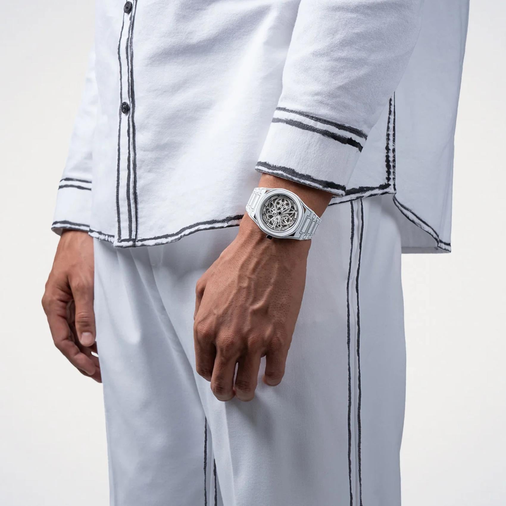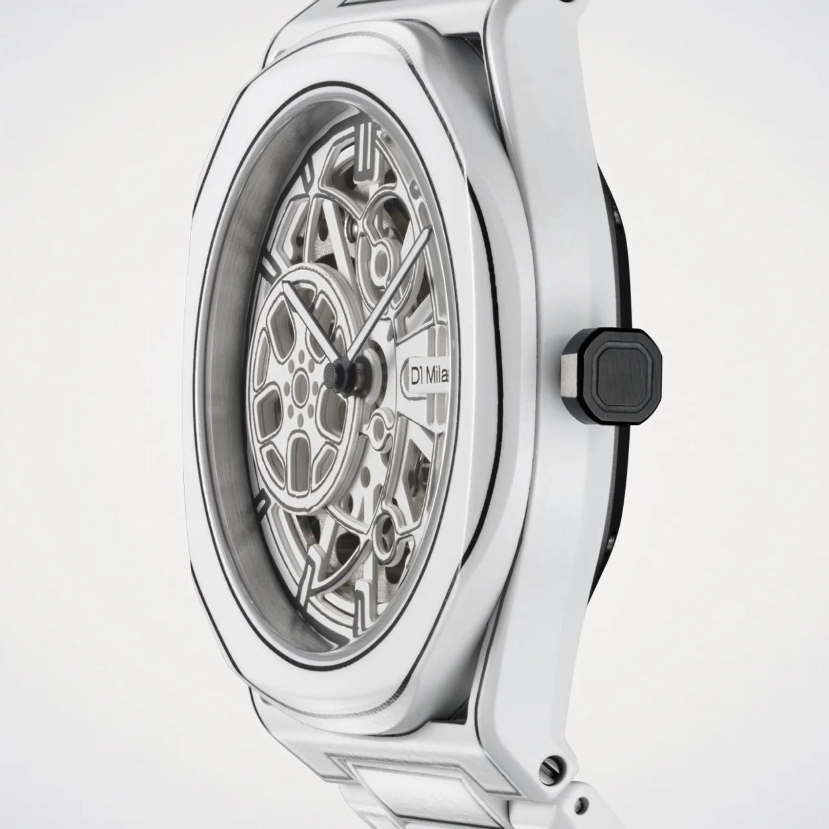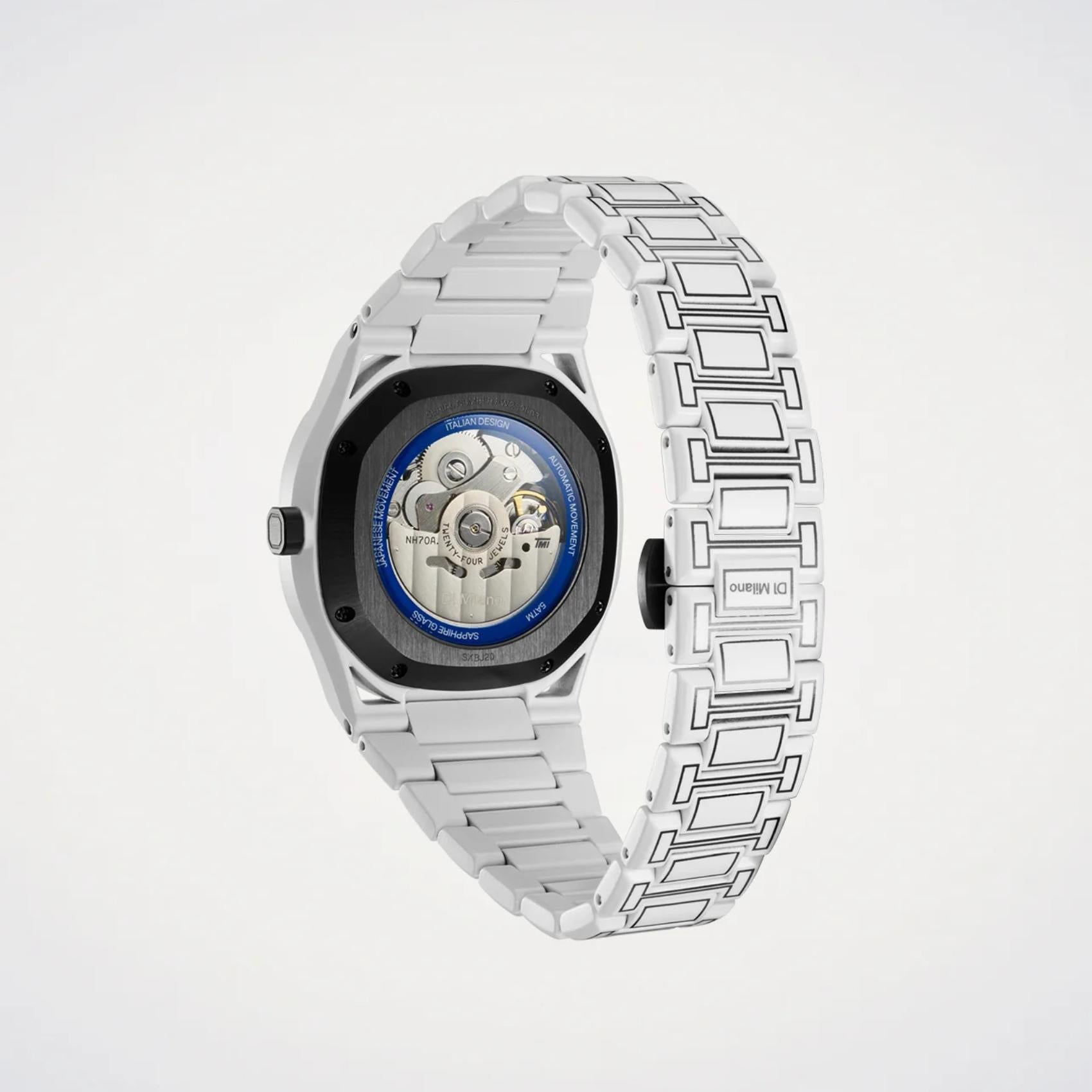 Ανδρικό ρολόι D1 Milano Skeleton White Sketch D1-SKBJ20 με άσπρο ατσάλινο μπρασελέ και άσπρο skeleton καντράν διαμέτρου 40.5mm που αναδυκνύει τον μηχανισμό στο εσωτερικό του. Λειτουγεί με αυτόματο μηχανισμό Seiko TMI-NH70L open back και έχει αχάρακτο κρύσταλλο από ζαφείρι ενώ είναι αδιάβροχο στα 50M/5ΑΤΜ που το καθιστά κατάλληλο για κολύμβηση.