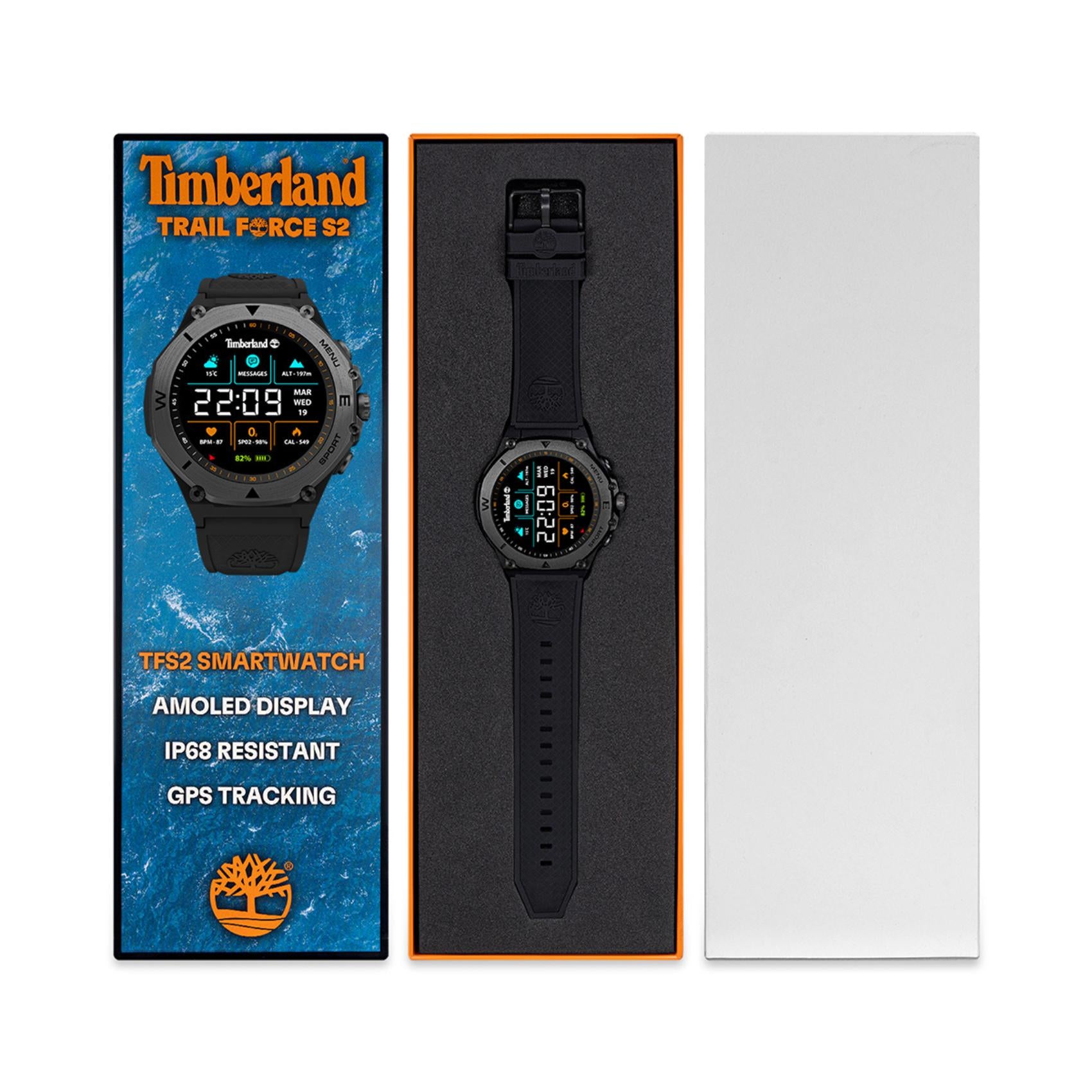 Smartwatch Timberland Trail Force S2 TDIGB0089801 με μαύρο λουράκι σιλικόνης και μαύρο καντράν διαμέτρου 50 mm. Έχει οθόνη Amoled 1,43 ιντσών, μαγνητική φόρτιση, συνδέεται με την εφαρμογή Trailforce, που είναι συμβατή με iOS και Android.