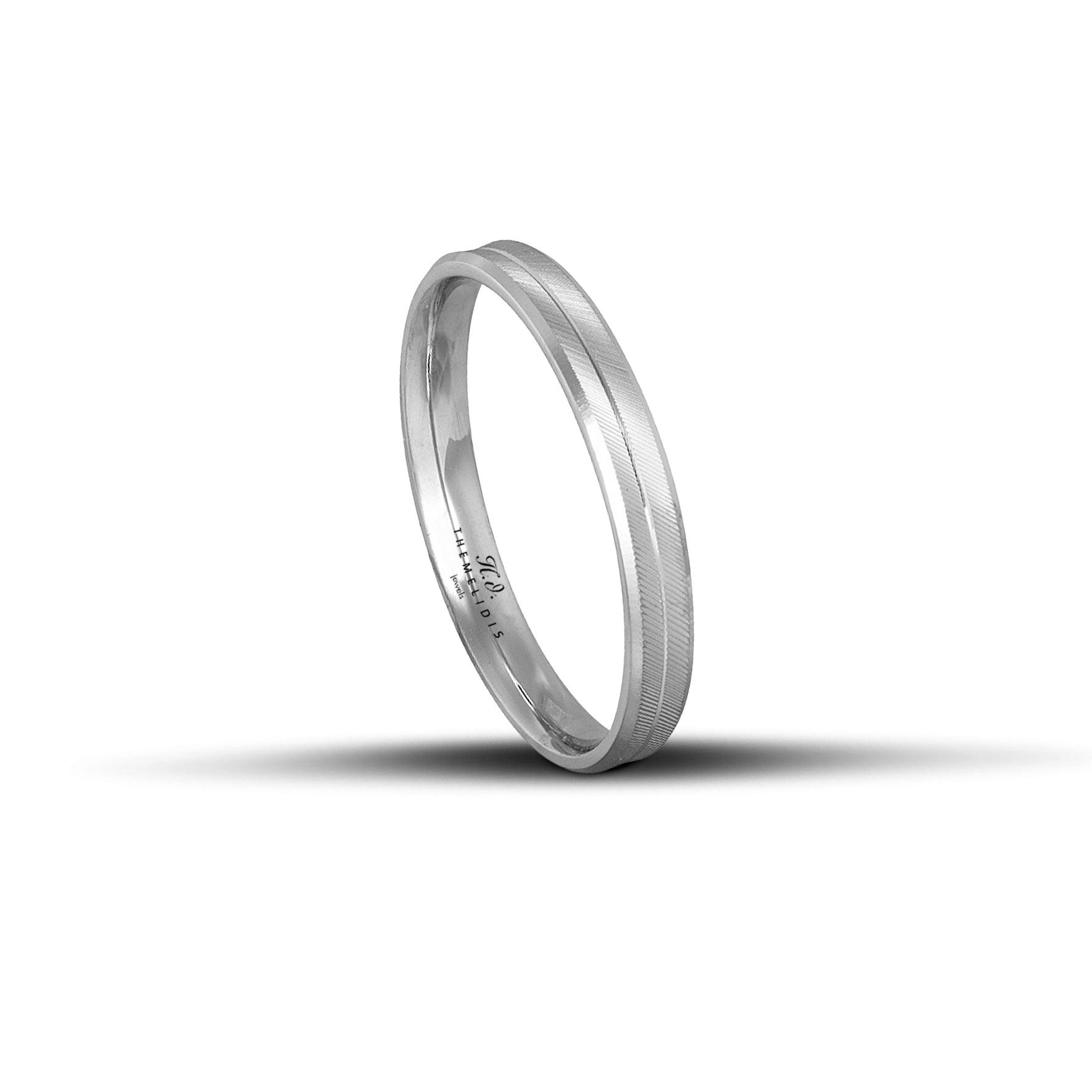 Μοντέρνες λευκόχρυσες βέρες γάμου με σαγρέ φινίρισμα και μια διακριτική γραμμή στη μέση που προσθέτει κίνηση και γεωμετρική ισορροπία στο σχέδιο. Με πλάτος 3 mm, αποτελούν μια minimal αλλά ιδιαίτερη επιλογή για ζευγάρια που εκτιμούν τη διακριτικότητα και το εκλεπτυσμένο design.