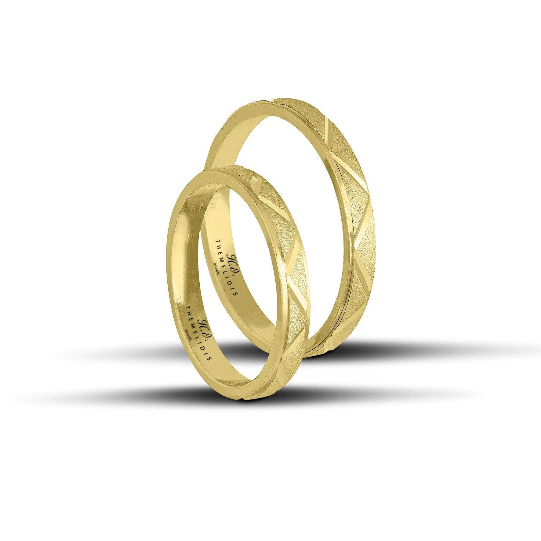 Ένα ζευγάρι μοντέρνες βέρες γάμου χρυσες κατασκευασμένες χειροποίητα για διαχρονική αντοχή. Οι βέρες έχουν φινίρισμα από αμμοβολή που συνδυάζεται από ένα μοτίβο διαγώνιων γραμμών που σχηματίζουν ένα επανλαμβανόμενο "V" περιμετρικά στην βέρα και κοφτό τελείωμα στις άκρες που αναδυκνύουν την ματ επιφάνεια, συνολικού πλάτους 3mm. Διαθέτουν ανατομικό σχεδιασμό για επιπλέον άνεση όταν φορεθεί στο δάχτυλο σας.