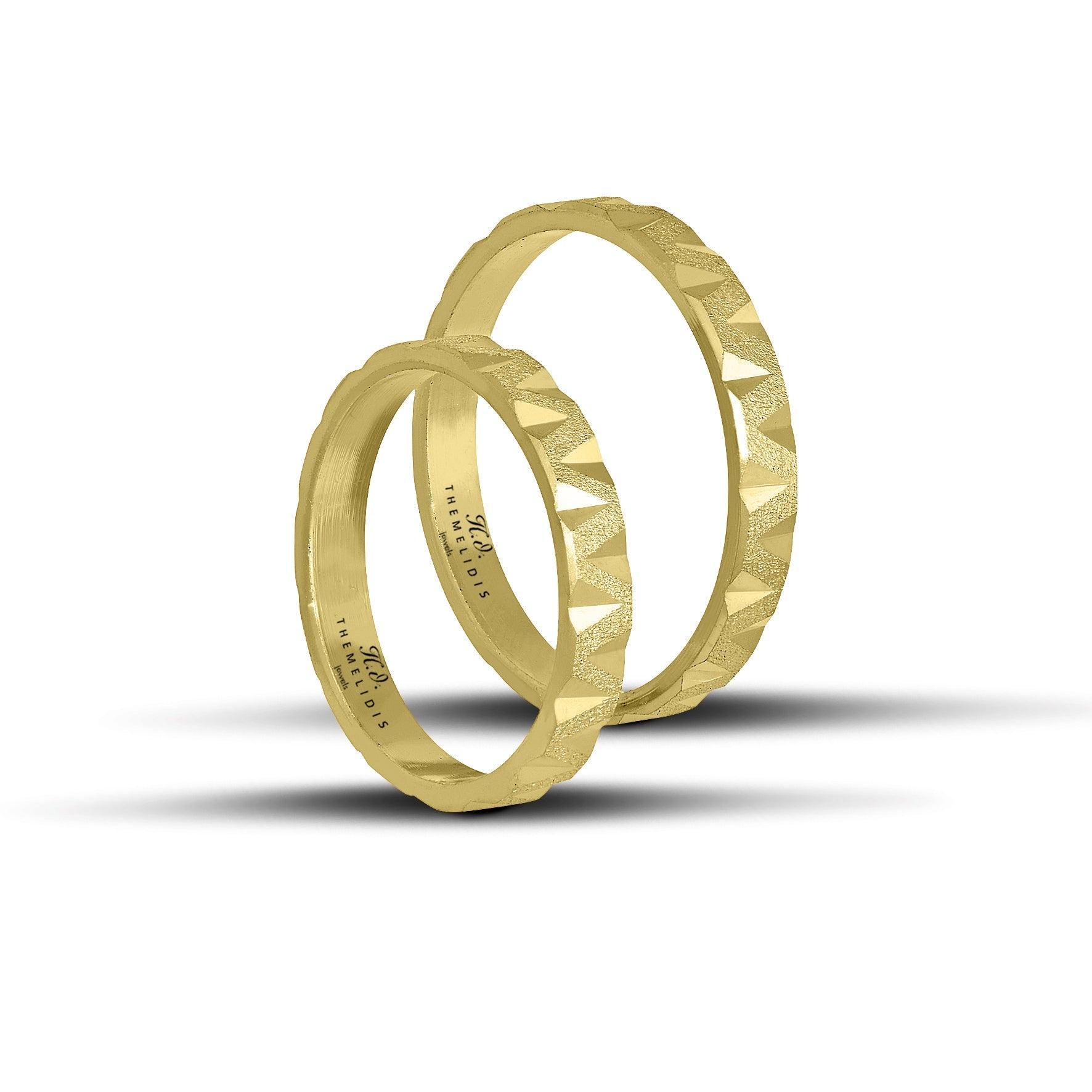 Ένα ζευγάρι μοντέρνες βέρες γάμου χρυσές κατασκευασμένες χειροποίητα για διαχρονική αντοχή. Οι βέρες συνδυάζουν φινίρσμα αμμοβολής με λουστράτη επιφάνεια και έχουν ένα επαναλαμβανόμενο μοτίβο από "V" που δίνει ιδιαίτερη υφή στο τελικό αποτέλεσμα. Η κάθε βέρα έχει συνολικό πλάτος 3.3mm με ανατομικό σχεδιασμό για επιπλέον άνεση όταν φορεθεί στο δάχτυλο σας.