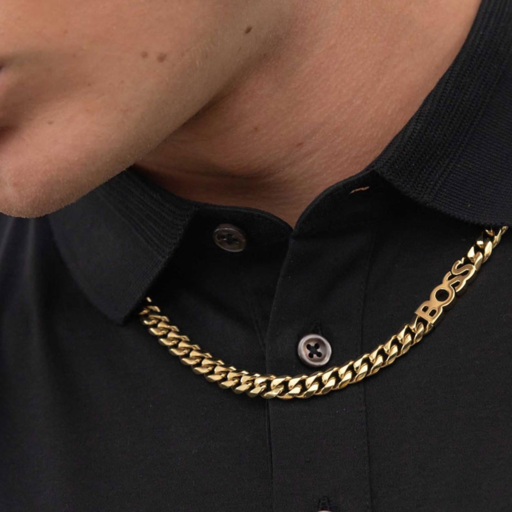 Ανδρικό κολιέ αλυσίδα Boss 1580770 κατασκευασμένο από ανοξείδωτο ατσάλι σε χρυσό χρώμα. Συνδυάζει μια επιβλητική αλυσίδα τύπου curb πάχους 8mm και μήκους 50cm που ισορροπεί τέλεια ανάμεσα στη διαχρονική αντοχή και το απαράμιλλο στυλ με το iconic λογότυπο. Αποστέλλεται σε συσκευασία δώρου, με πιστοποιητικό γνησιότητας από την επίσημη αντιπροσωπεία της Boss.