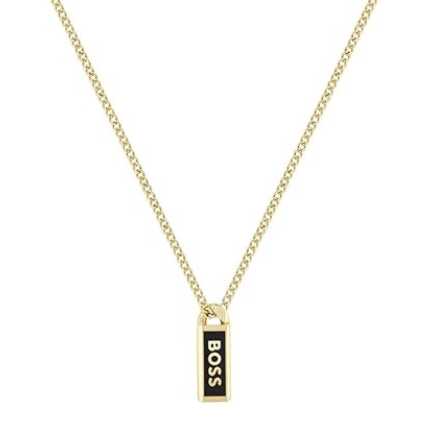 Ανδρικό κολιέ Boss 1580678 ατσάλινο σε χρυσό χρώμα με κρεμαστό στοιχείο διπλής όψεως σε μαύρο/χρυσό χρώμα. Η αλυσίδα έχει μήκος 55.8cm και αποστέλλεται σε συσκευασία δώρου, με πιστοποιητικό γνησιότητας από την επίσημη αντιπροσωπεία της Boss.