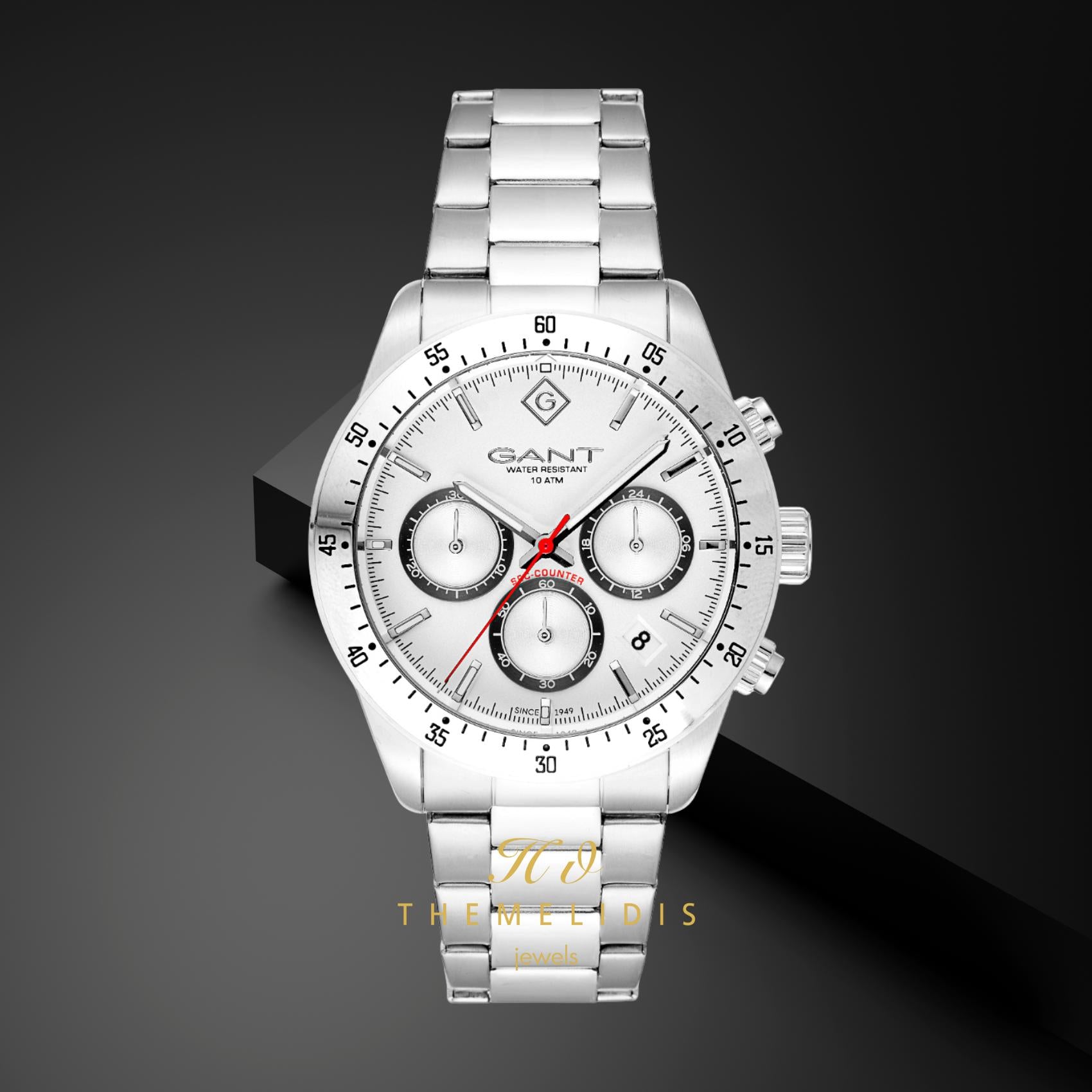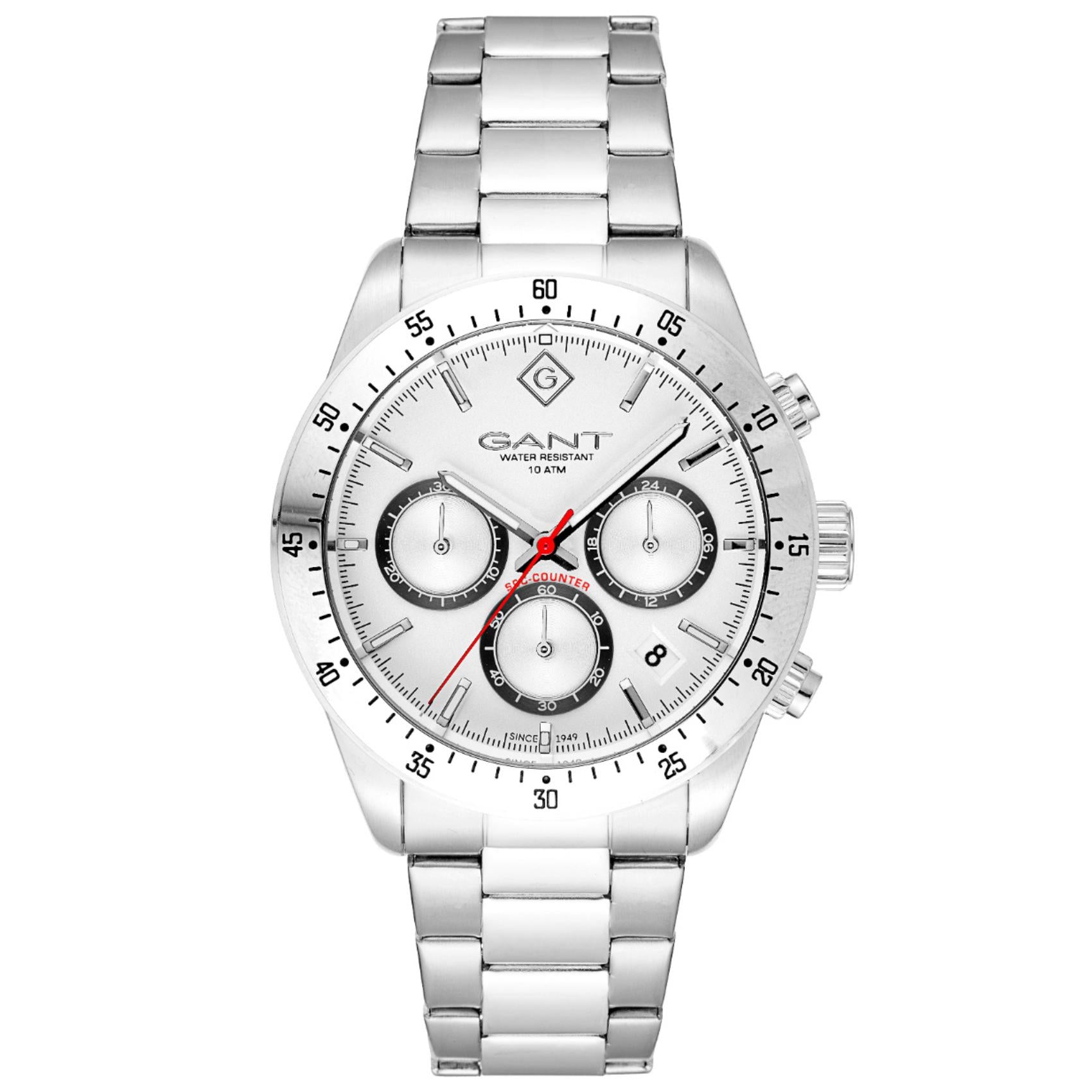 Ρολόι Gant Greenfield G202001 χρονογράφος με ασημί ατσάλινο μπρασελέ και άσπρο καντράν διαμέτρου 41mm με κρύσταλλο από ορυκτό ειδικής σκλήρυνσης. Λειτουργεί με μηχανισμό μπαταρίας, έχει λειτουργία χρονογράφου με ένδειξη ημερομηνίας και είναι αδιάβροχο με στεγανότητα στα 10ATM-100Μ που το καθιστά κατάλληλο για κολύμβηση.