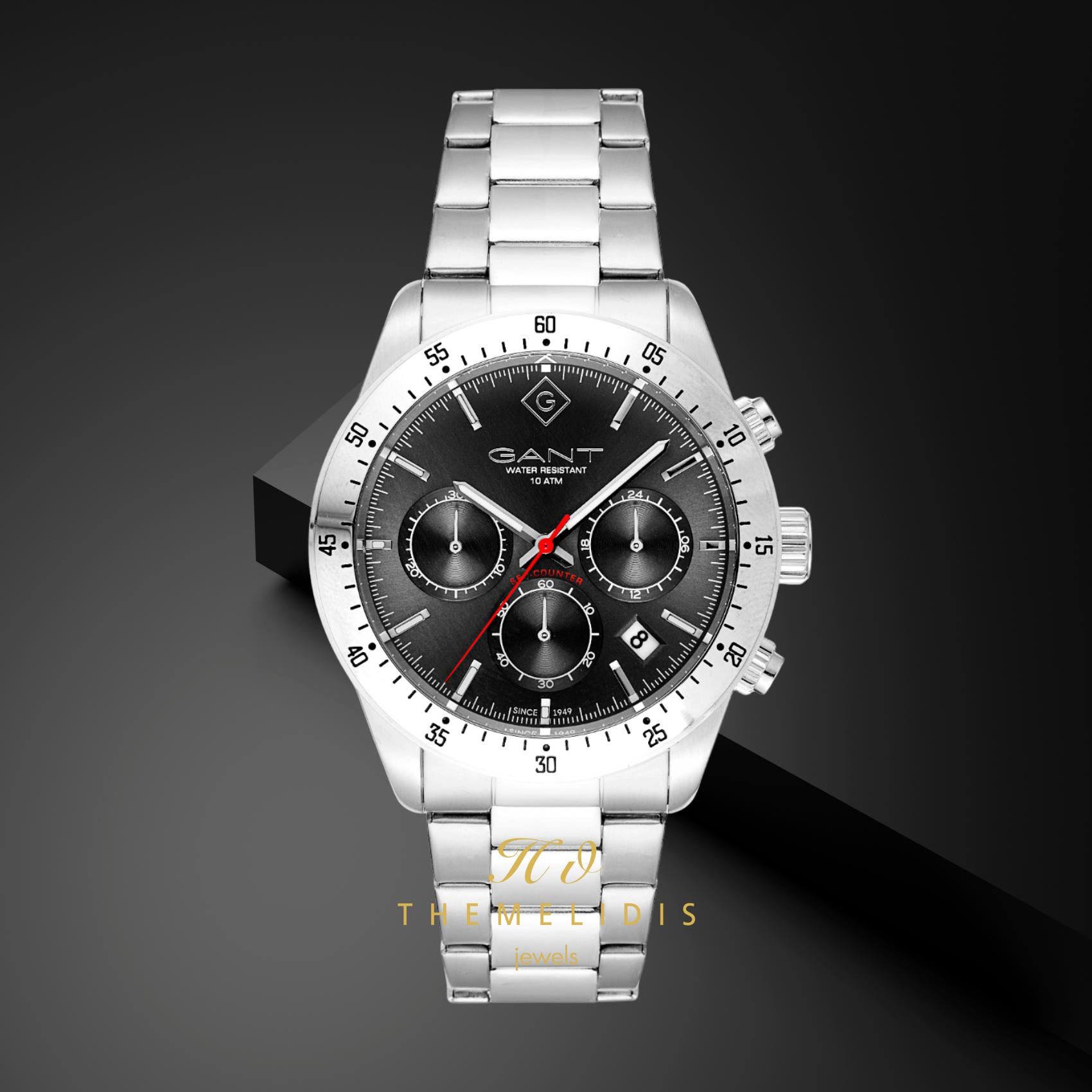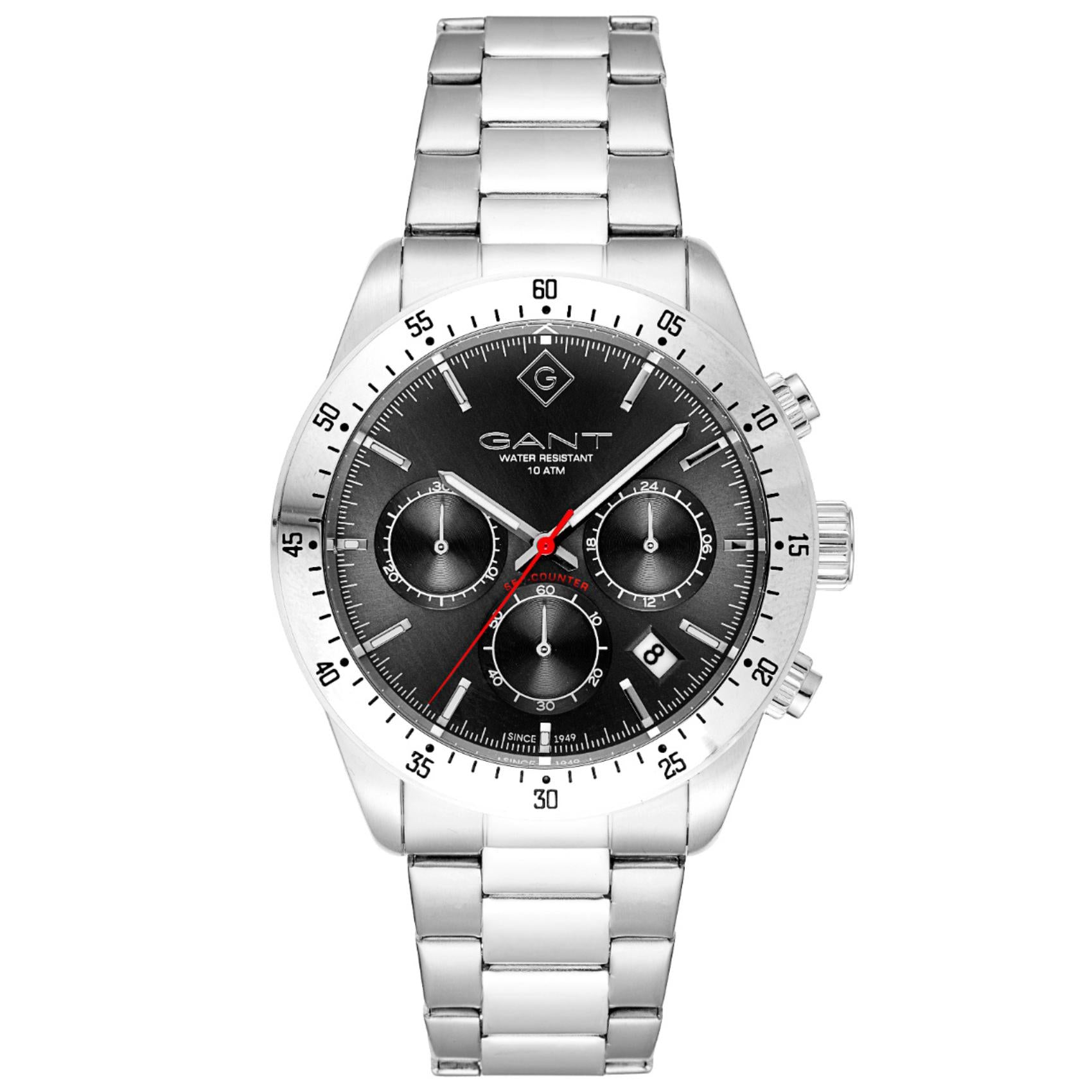 Ρολόι Gant Greenfield G202002 χρονογράφος με ασημί ατσάλινο μπρασελέ και μαύρο καντράν διαμέτρου 41mm με κρύσταλλο από ορυκτό ειδικής σκλήρυνσης. Λειτουργεί με μηχανισμό μπαταρίας, έχει λειτουργία χρονογράφου με ένδειξη ημερομηνίας και είναι αδιάβροχο με στεγανότητα στα 10ATM-100Μ που το καθιστά κατάλληλο για κολύμβηση.