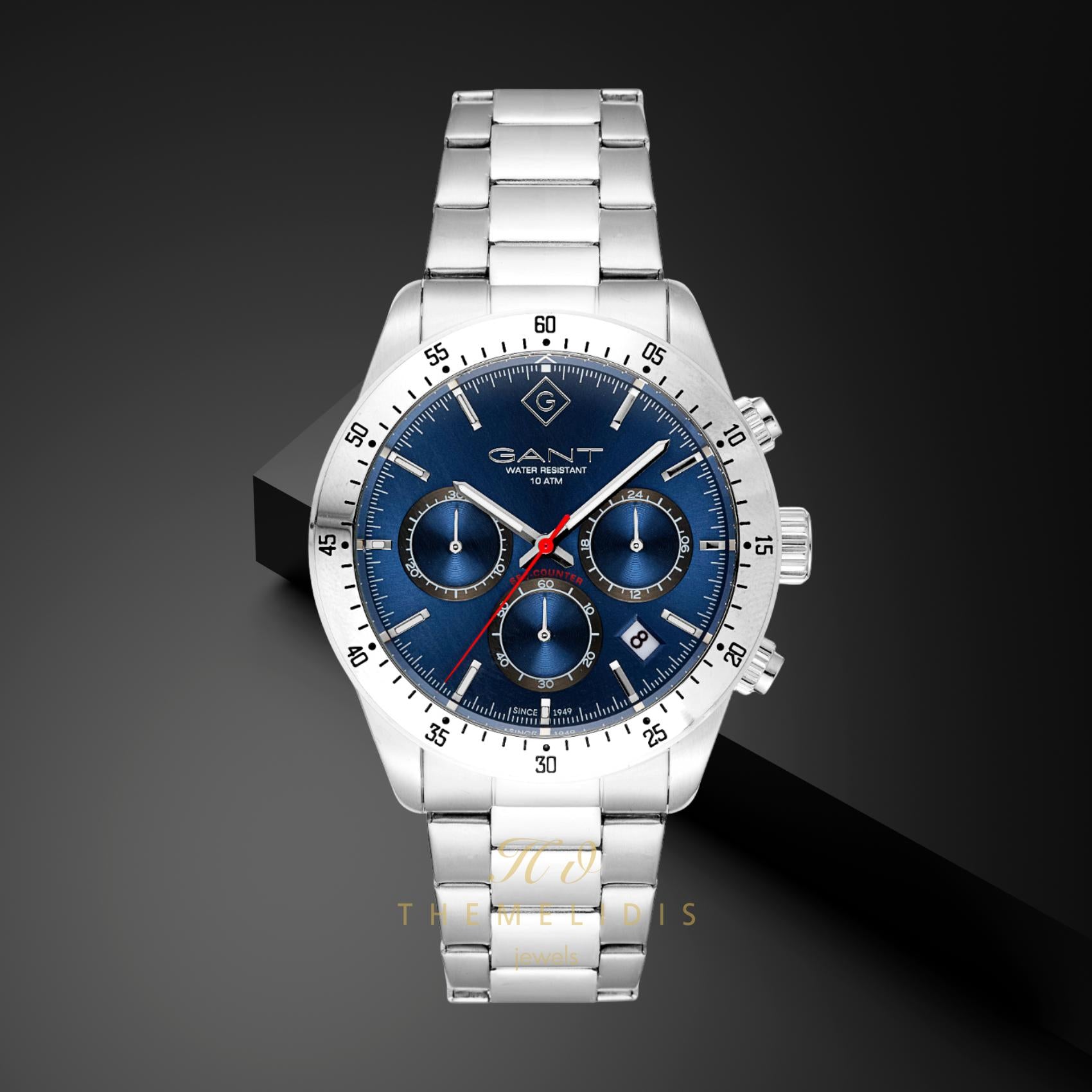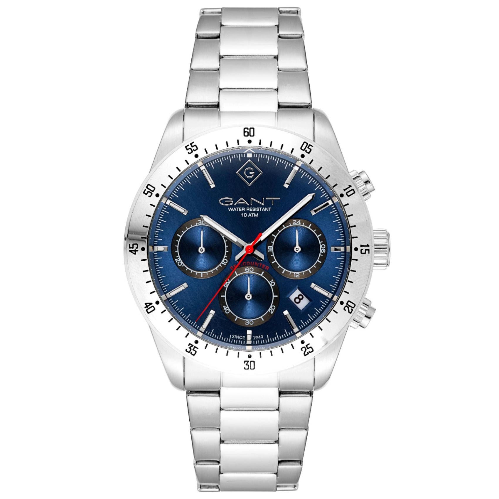 Ρολόι Gant Greenfield G202003 χρονογράφος με ασημί ατσάλινο μπρασελέ και μπλε καντράν διαμέτρου 41mm με κρύσταλλο από ορυκτό ειδικής σκλήρυνσης. Λειτουργεί με μηχανισμό μπαταρίας, έχει λειτουργία χρονογράφου με ένδειξη ημερομηνίας και είναι αδιάβροχο με στεγανότητα στα 10ATM-100Μ που το καθιστά κατάλληλο για κολύμβηση.