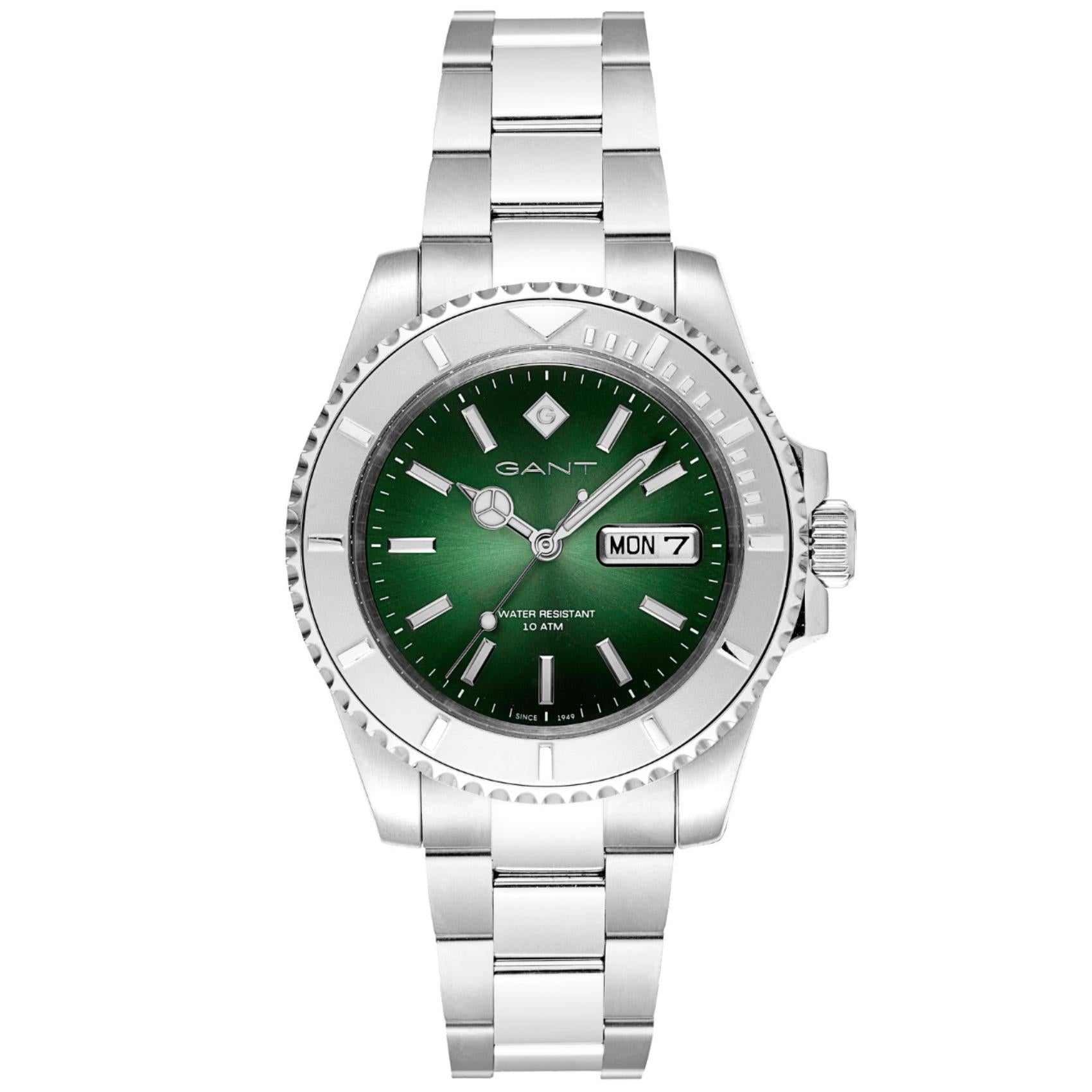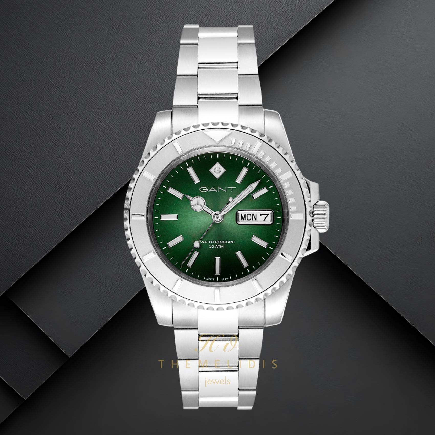 Ρολόι Gant Watertown G204003 με ασημί ατσάλινο μπρασελέ και πράσινο καντράν διαμέτρου 41mm με κρύσταλλο από ορυκτό ειδικής σκλήρυνσης. Λειτουργεί με μηχανισμό μπαταρίας, έχει ένδειξη ημέρας/ημερομηνίας και είναι αδιάβροχο με στεγανότητα στα 10ATM-100Μ που το καθιστά κατάλληλο για κολύμβηση.
