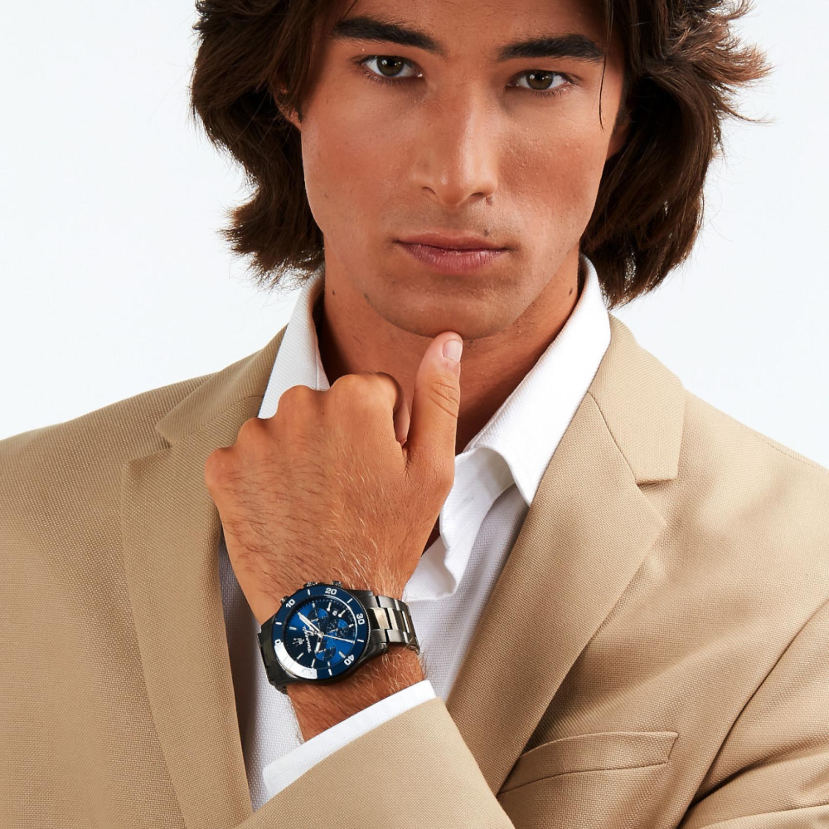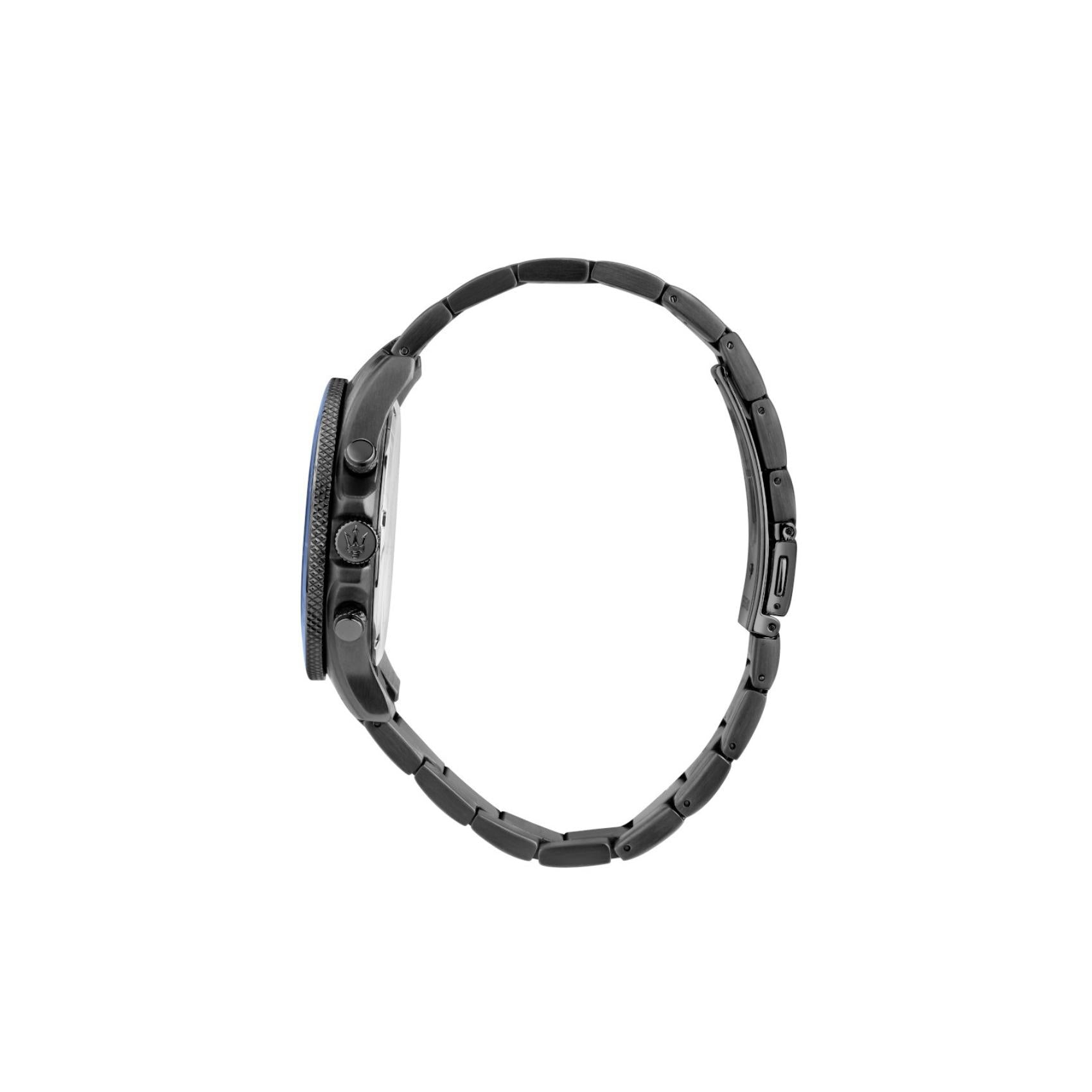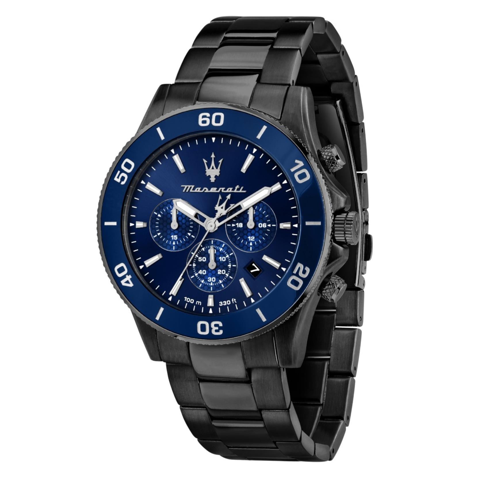 Ανδρικό ρολόι Maserati Competizione R8873600005 χρονογράφος που συνδυάζει μαύρο μπρασελέ από PVD Gun, μπλε καντράν με ασημένιους δείκτες και κάσα διαμέτρου 43mm. Έχει ένδειξη ημερομηνίας, τζαμάκι από ορυκτό κρύσταλλο ειδικής σκλήρυνσης και λειτουργεί με μηχανισμό μπαταρίας Quartz ακριβείας. Το ρολόι είναι αδιάβροχο με στεγανότητα στα 100M/10ΑΤΜ που το καθιστά κατάλληλο για κολύμβηση.