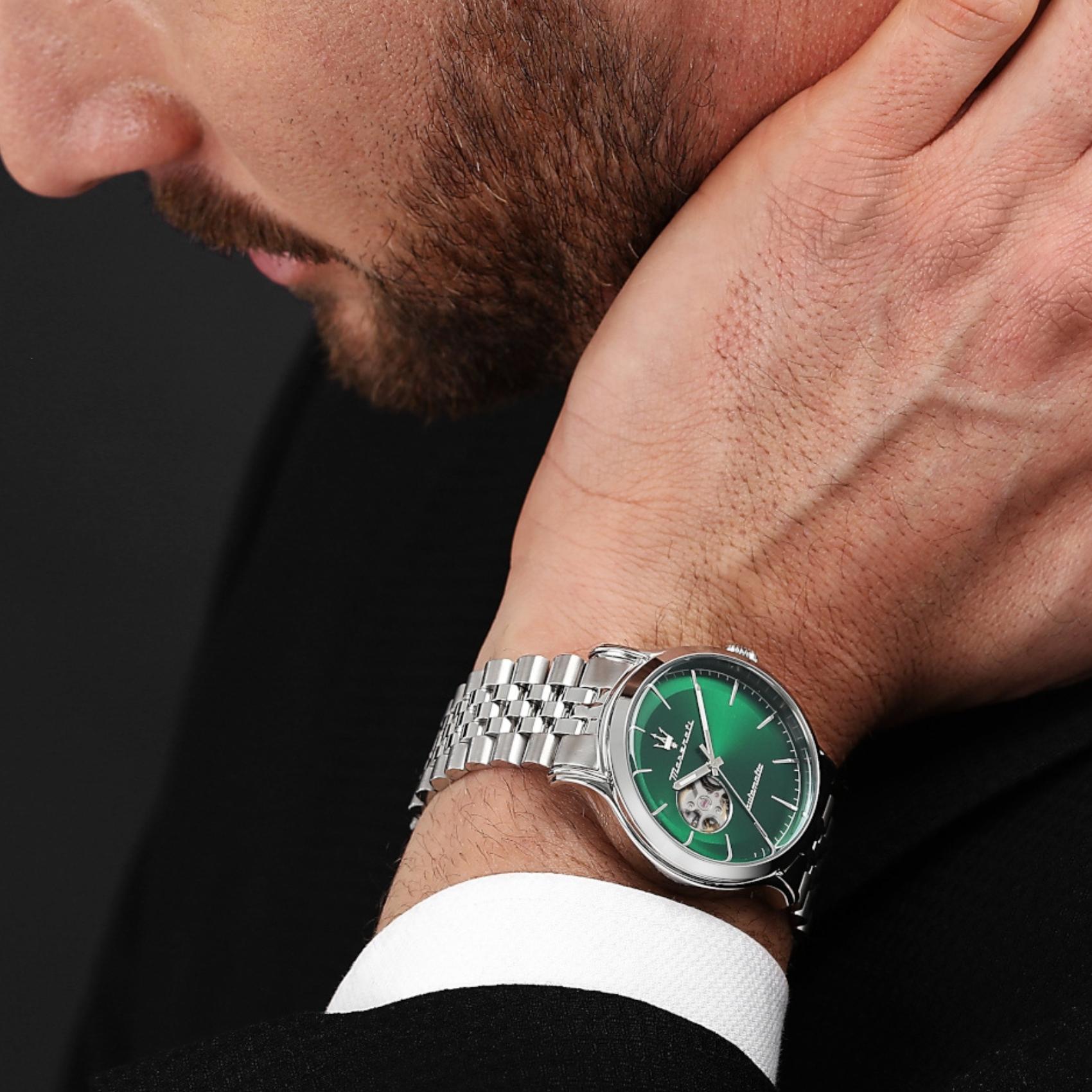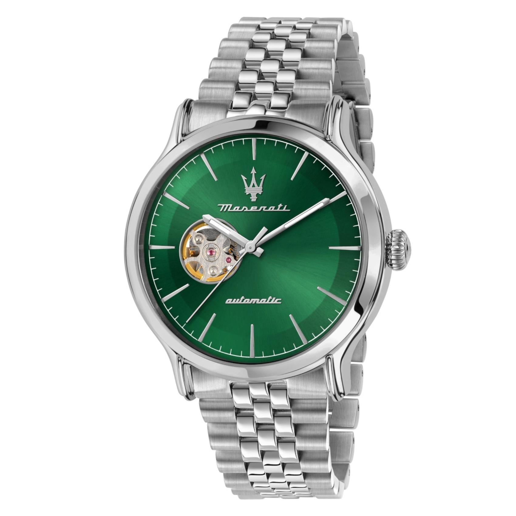Ανδρικό ρολόι Maserati Epoca R8823118019 με ασημί μπρασελέ από ανοξείδωτο ατσάλι και πράσινο καντράν, ασημένιους δείκτες, κάσα διαμέτρου 42mm και εμφανή μηχανισμό Open Back. Έχει αχάρακτο τζαμάκι από ζαφείρι και λειτουργεί με αυτόματο μηχανισμό. Το ρολόι είναι αδιάβροχο με στεγανότητα στα 100M/10ΑΤΜ που το καθιστά κατάλληλο για κολύμβηση.