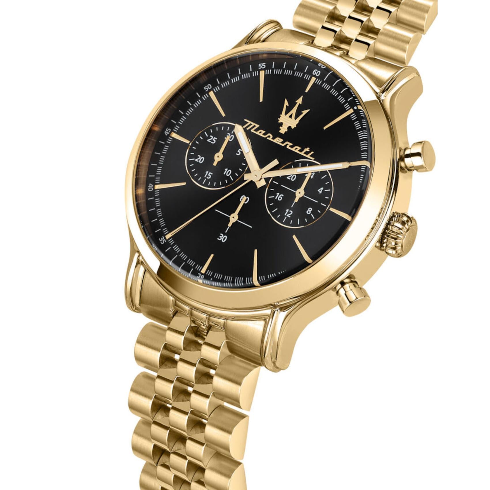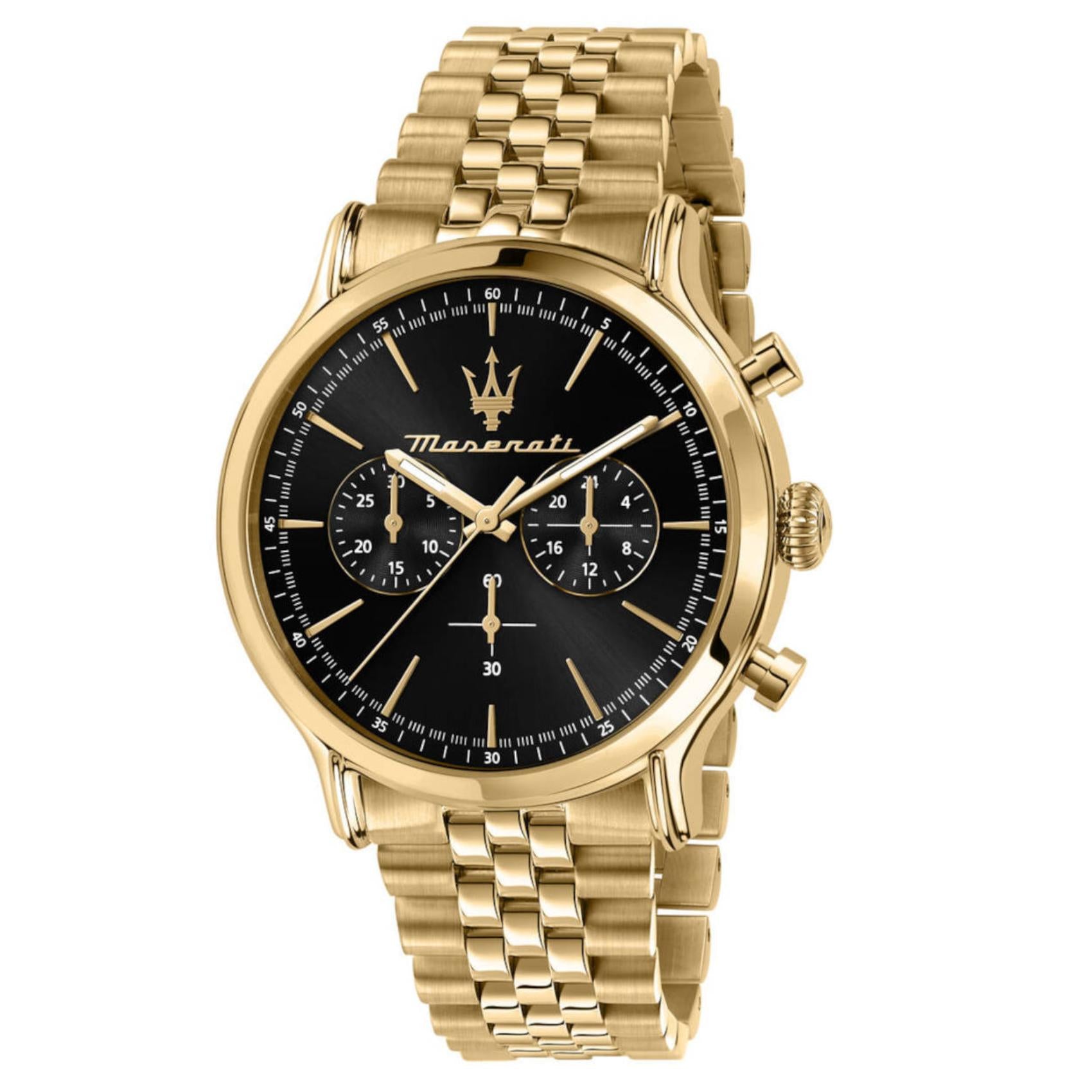 Ανδρικό ρολόι Maserati Epoca R8873618023 χρονογράφος με χρυσό μπρασελέ από ανοξείδωτο ατσάλι και μαύρο καντράν, χρυσούς δείκτες και κάσα διαμέτρου 42mm. Έχει τζάμάκι από ορυκτό κρύσταλλο ειδικής σκλήρυνσης και λειτουργεί με μηχανισμό μπαταρίας Quartz ακριβείας. Το ρολόι είναι αδιάβροχο με στεγανότητα στα 100M/10ΑΤΜ που το καθιστά κατάλληλο για κολύμβηση.