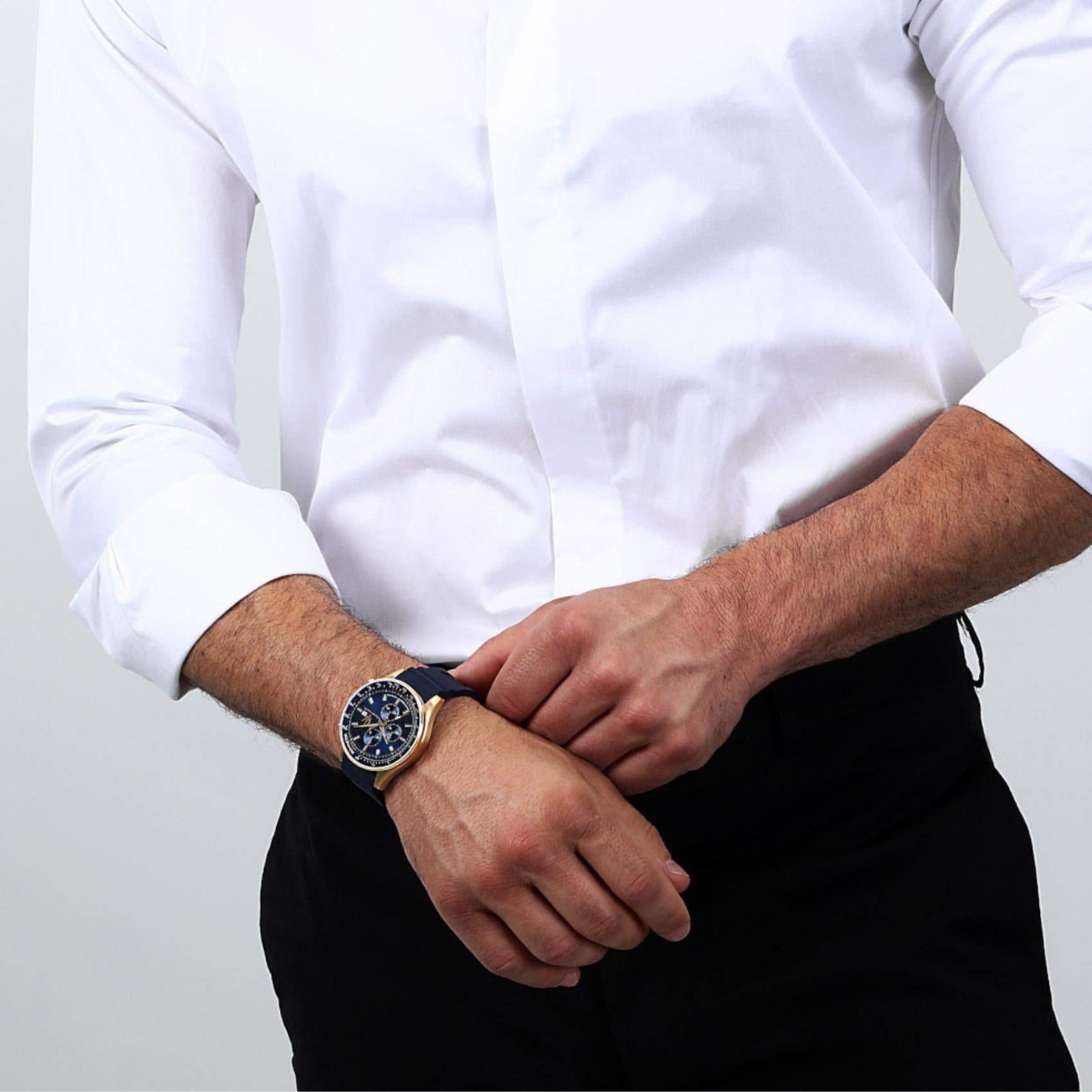 Ανδρικό ρολόι Maserati Sfida R8871640004 χρονογράφος με μπλε λουράκι από καουτσούκ, μπλε καντράν, επίχρυσους δείκτες και χρυσή κάσα διαμέτρου 44mm. Έχει τζάμάκι από ορυκτό κρύσταλλο ειδικής σκλήρυνσης, ένδειξη ημερομηνίας και μηχανισμό μπαταρίας Quartz ακριβείας. Το ρολόι είναι αδιάβροχο με στεγανότητα στα 100M/10ΑΤΜ που το καθιστά κατάλληλο για κολύμβηση.