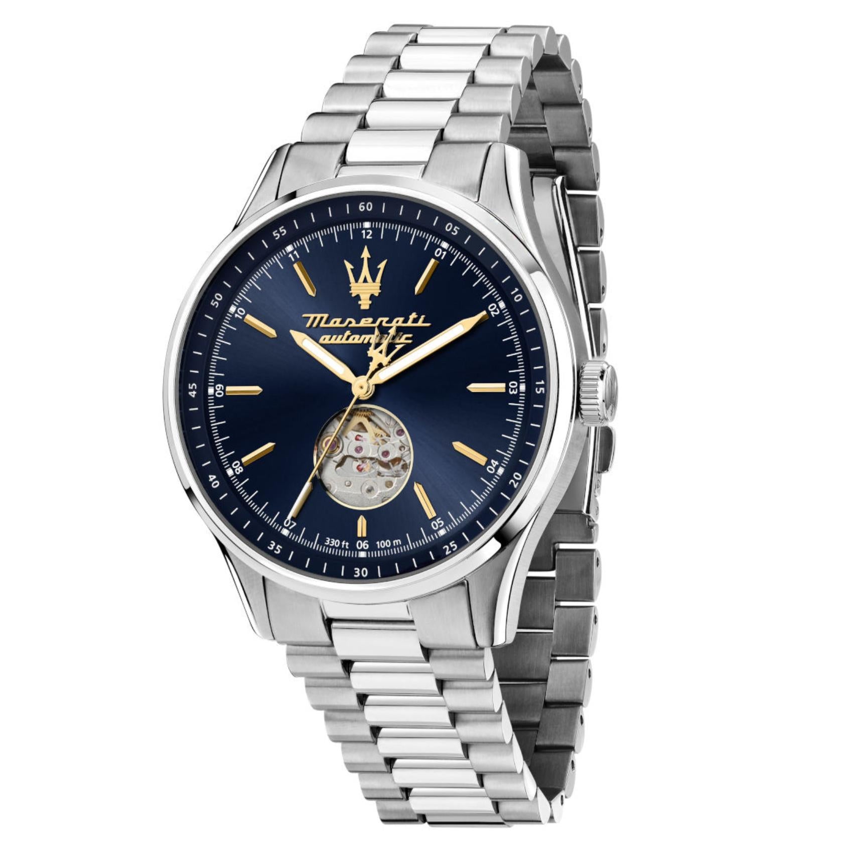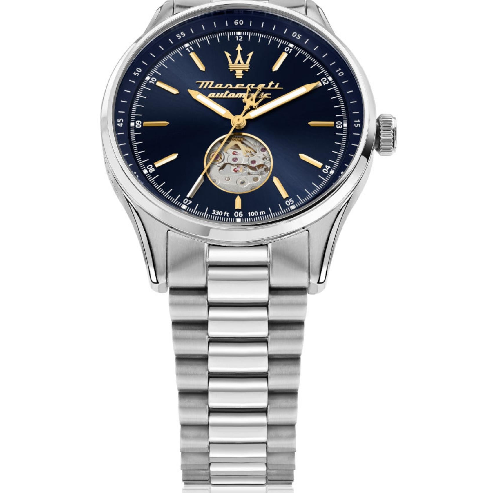 Ανδρικό ρολόι Maserati Sorpasso R8823124002 με ασημί μπρασελέ από ανοξείδωτο ατσάλι και μπλε καντράν με εμφανή μηχανισμό, επίχρυσους δείκτες και κάσα διαμέτρου 42mm. Έχει αχάρακτο τζαμάκι από ζαφείρι και λειτουργεί με αυτόματο μηχανισμό. Το ρολόι είναι αδιάβροχο με στεγανότητα στα 100M/10ΑΤΜ που το καθιστά κατάλληλο για κολύμβηση.