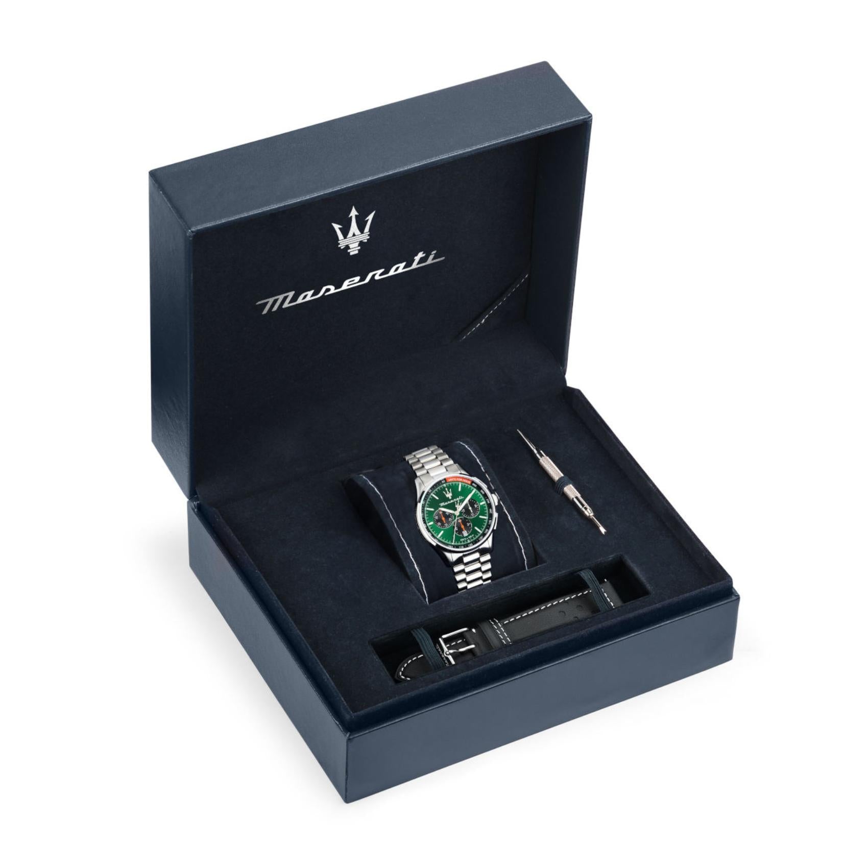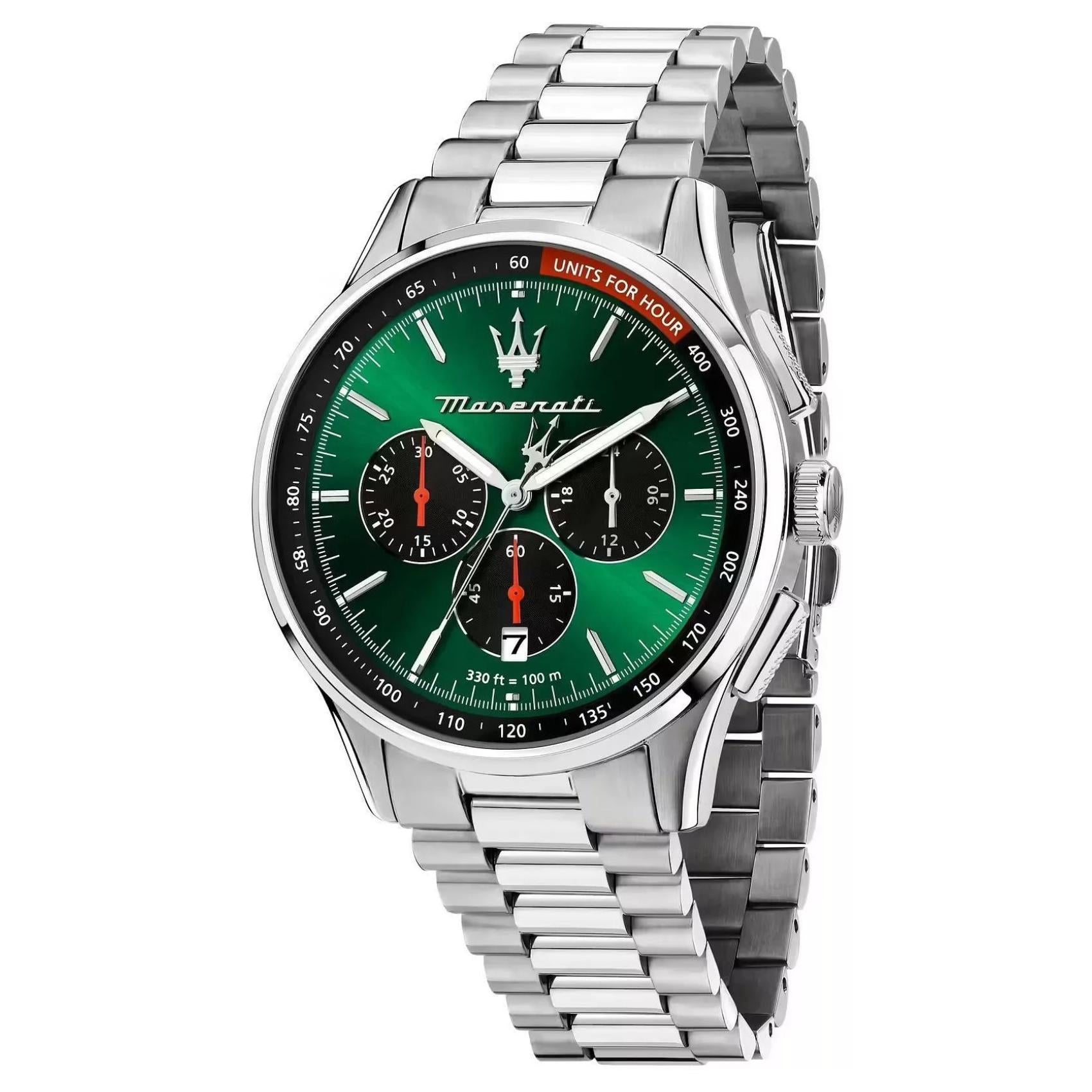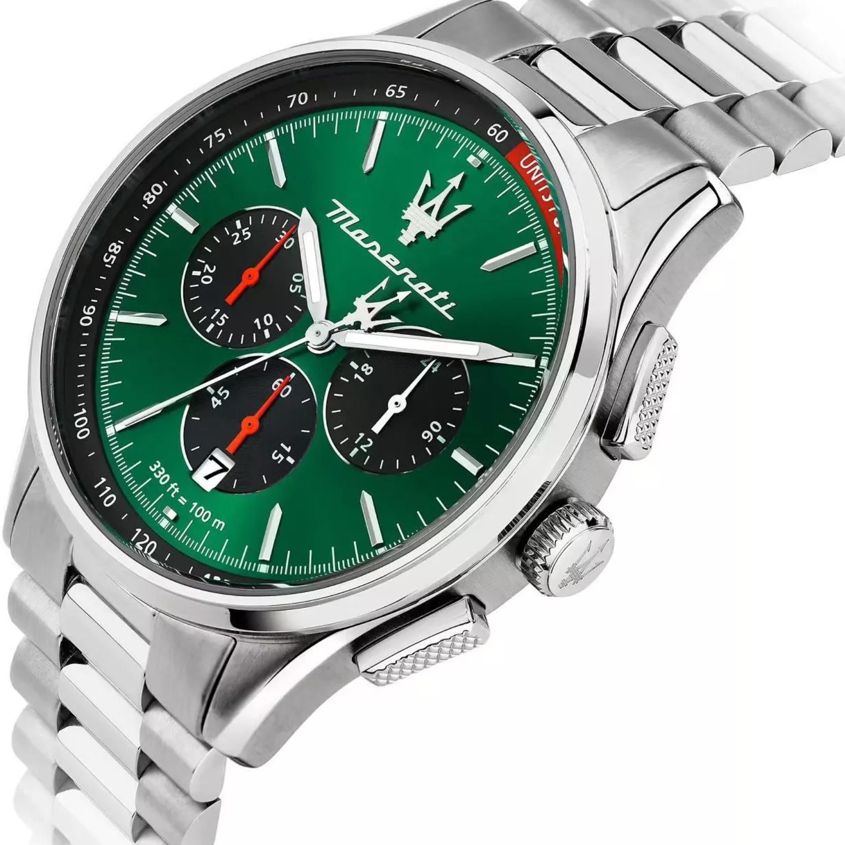Ανδρικό ρολόι Maserati Sorpasso R8873624002 χρονογράφος που συνδυάζει ασημί μπρασελέ από ανοξείδωτο ατσάλι και πράσινο καντράν, ασημί δείκτες και κάσα διαμέτρου 42mm. Έχει ένδειξη ημερομηνίας, τζάμάκι από ορυκτό κρύσταλλο ειδικής σκλήρυνσης και λειτουργεί με μηχανισμό μπαταρίας Quartz ακριβείας. Το ρολόι είναι αδιάβροχο με στεγανότητα στα 100M/10ΑΤΜ που το καθιστά κατάλληλο για κολύμβηση. Η συσκευασία περιλαμβάνει και ένα μαύρο δερμάτινο λουράκι.