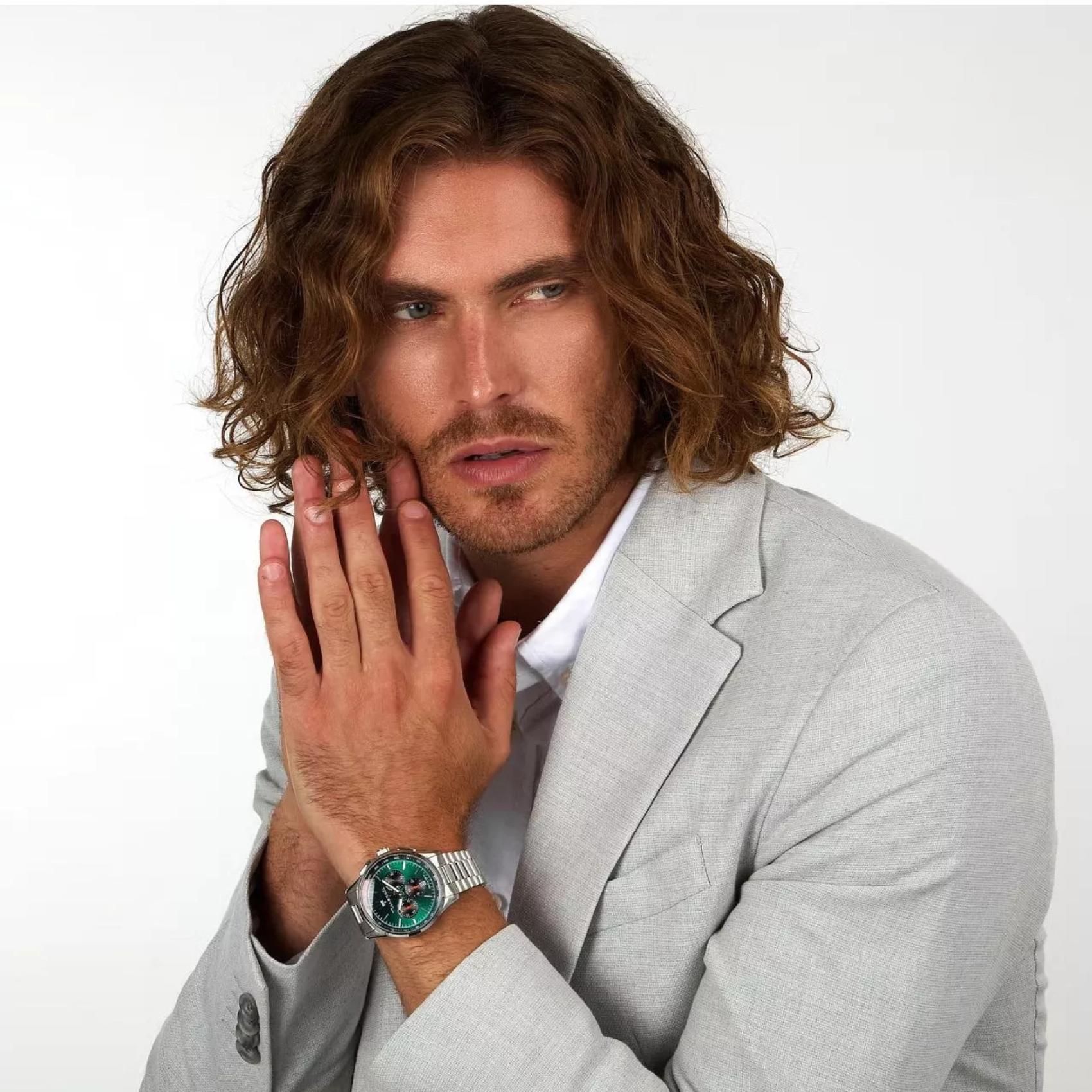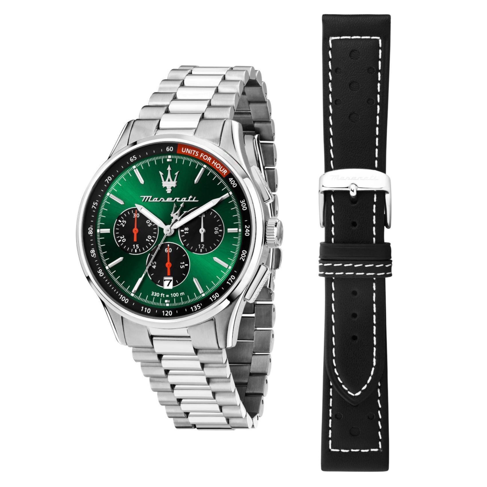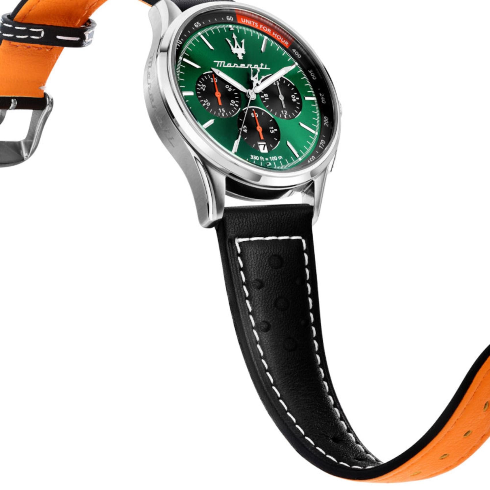 Ανδρικό ρολόι Maserati Sorpasso R8873624002 χρονογράφος που συνδυάζει ασημί μπρασελέ από ανοξείδωτο ατσάλι και πράσινο καντράν, ασημί δείκτες και κάσα διαμέτρου 42mm. Έχει ένδειξη ημερομηνίας, τζάμάκι από ορυκτό κρύσταλλο ειδικής σκλήρυνσης και λειτουργεί με μηχανισμό μπαταρίας Quartz ακριβείας. Το ρολόι είναι αδιάβροχο με στεγανότητα στα 100M/10ΑΤΜ που το καθιστά κατάλληλο για κολύμβηση. Η συσκευασία περιλαμβάνει και ένα μαύρο δερμάτινο λουράκι.