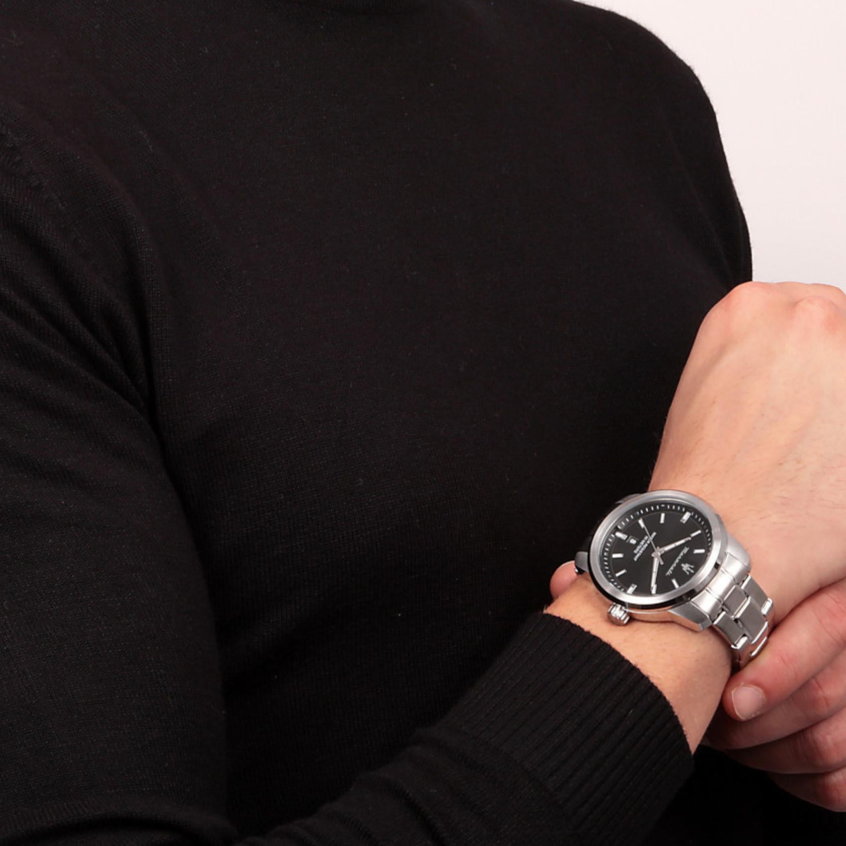 Ανδρικό ρολόι Maserati Successo R8853121006 με ασημί μπρασελέ από ανοξείδωτο ατσάλι και μαύρο καντράν, ασημένιους δείκτες και κάσα διαμέτρου 44mm. Έχει ένδειξη ημερομηνίας, τζάμάκι από ορυκτό κρύσταλλο ειδικής σκλήρυνσης και λειτουργεί με μηχανισμό μπαταρίας Quartz ακριβείας. Το ρολόι είναι αδιάβροχο με στεγανότητα στα 50M/5ΑΤΜ που το καθιστά κατάλληλο για κολύμβηση.