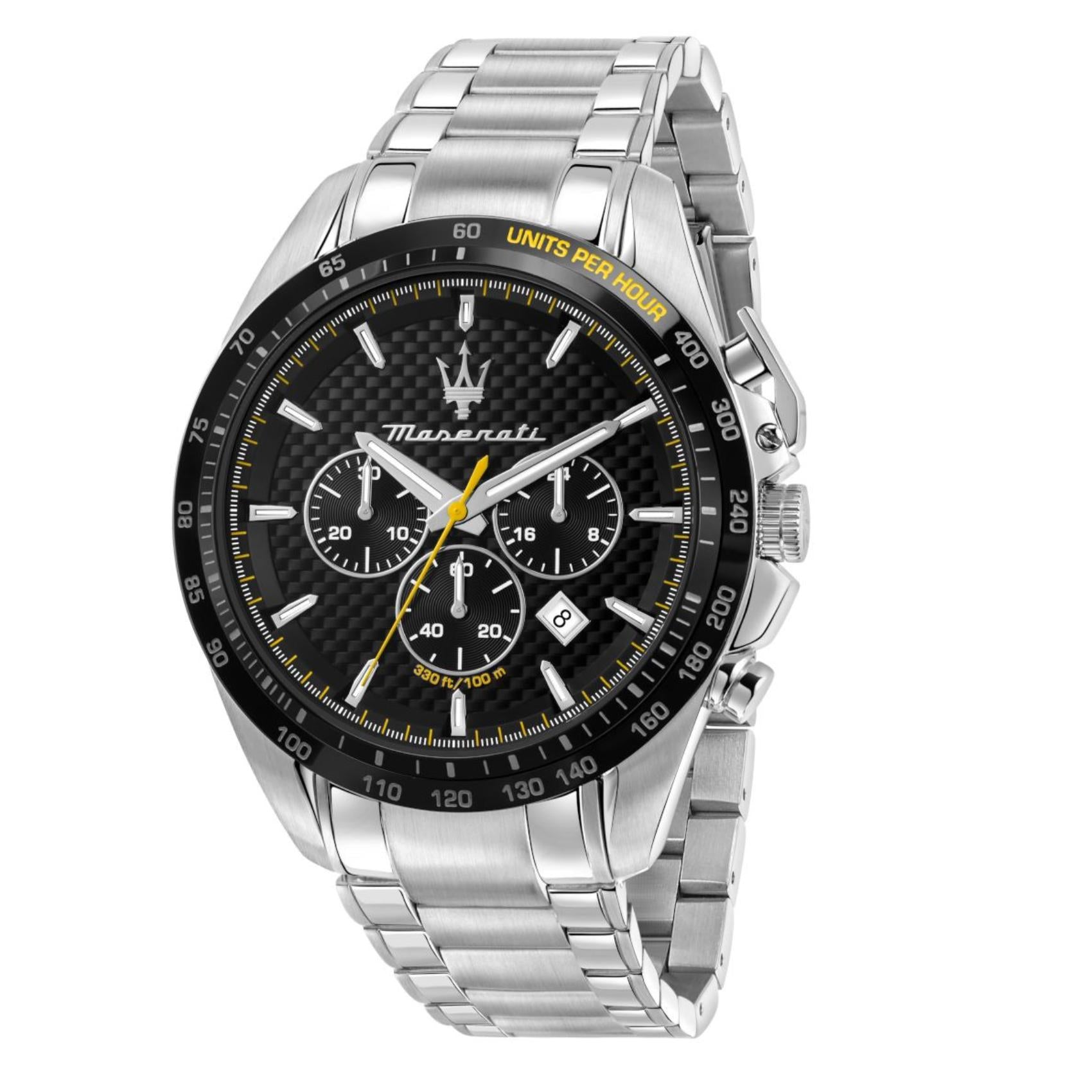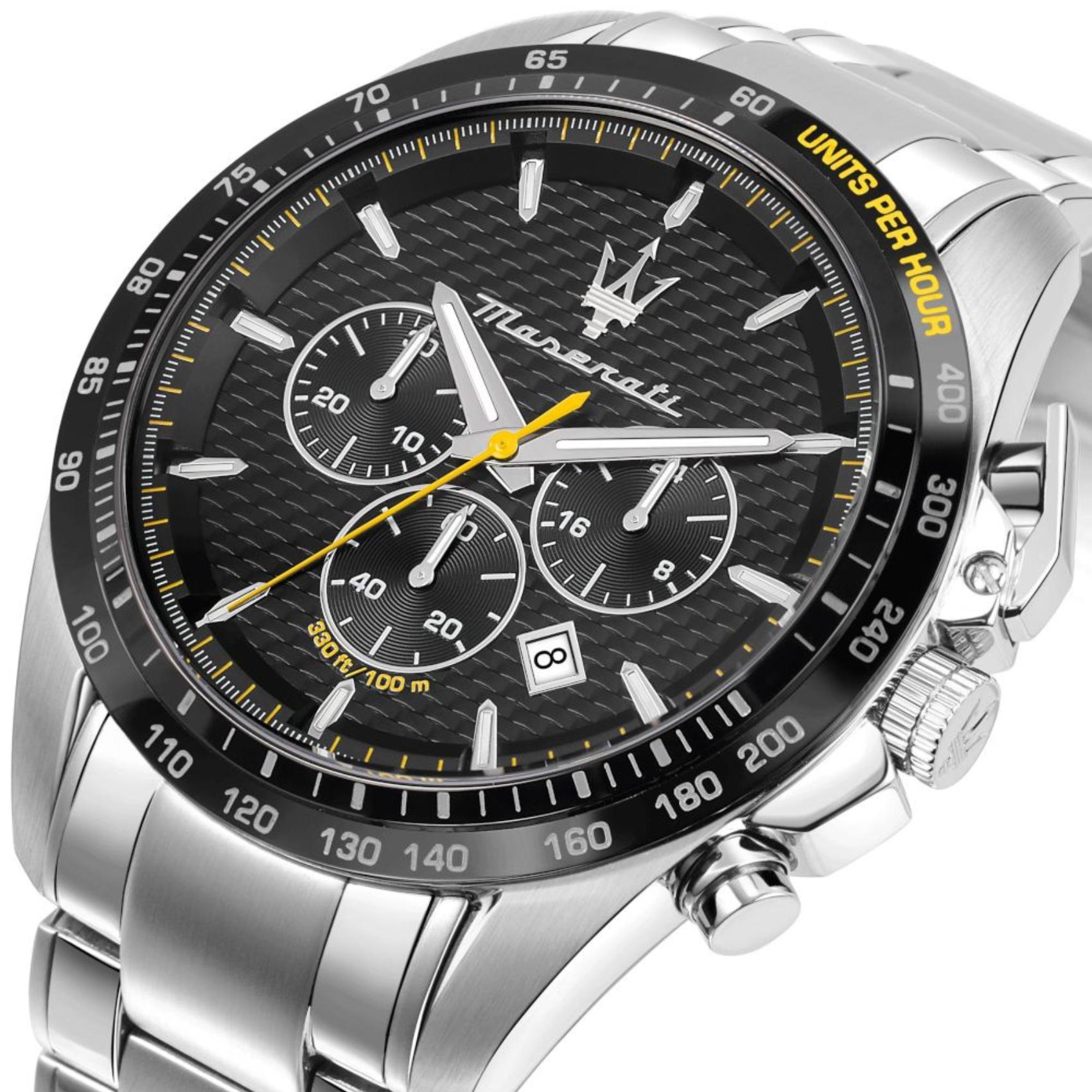 Ανδρικό ρολόι Maserati Traguardo R8873612042 χρονογράφος που συνδυάζει ασημί μπρασελέ από ανοξείδωτο ατσάλι και μαύρο καντράν, ασημί δείκτες και κάσα διαμέτρου 45mm. Έχει ένδειξη ημερομηνίας, τζάμάκι από ορυκτό κρύσταλλο ειδικής σκλήρυνσης και λειτουργεί με μηχανισμό μπαταρίας Quartz ακριβείας. Το ρολόι είναι αδιάβροχο με στεγανότητα στα 100M/10ΑΤΜ που το καθιστά κατάλληλο για κολύμβηση.