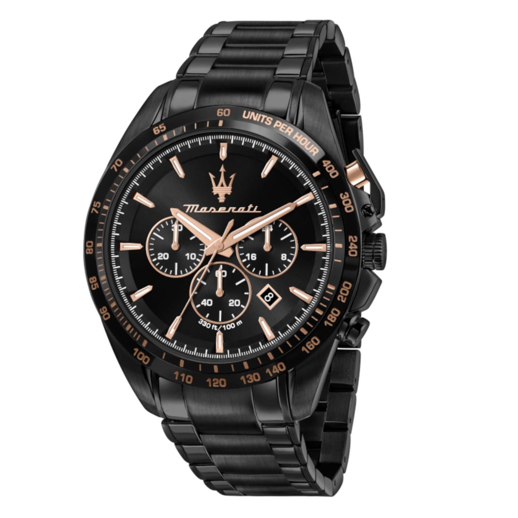 Ανδρικό ρολόι Maserati Traguardo R8873612048 χρονογράφος που συνδυάζει μαύρο μπρασελέ από ανοξείδωτο ατσάλι και μαύρο καντράν, ροζ επίχρυσους δείκτες και κάσα διαμέτρου 45mm. Έχει ένδειξη ημερομηνίας, τζάμάκι από ορυκτό κρύσταλλο ειδικής σκλήρυνσης και λειτουργεί με μηχανισμό μπαταρίας Quartz ακριβείας. Το ρολόι είναι αδιάβροχο με στεγανότητα στα 100M/10ΑΤΜ που το καθιστά κατάλληλο για κολύμβηση.