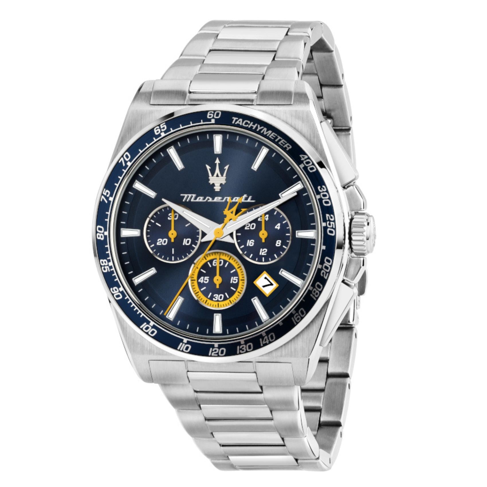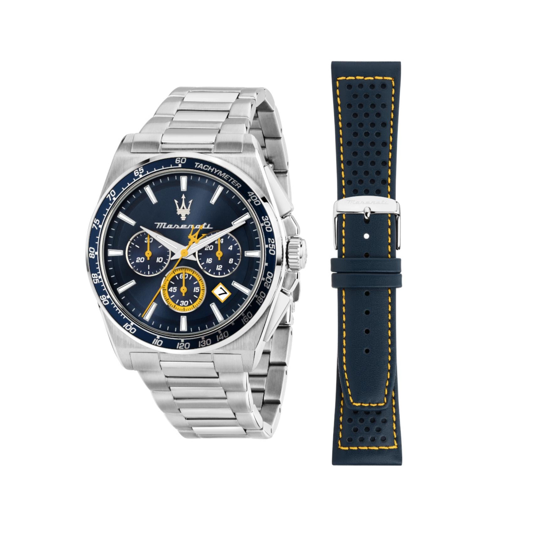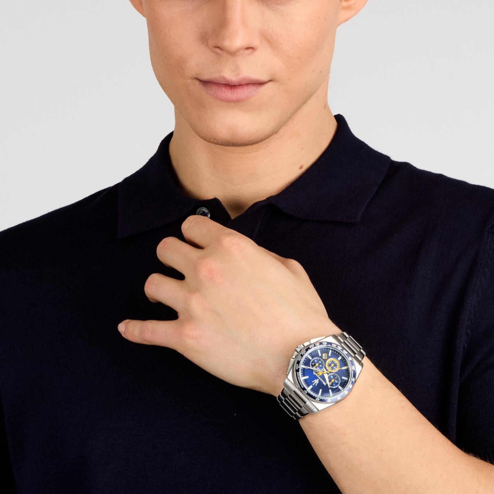 Ανδρικό ρολόι Maserati Velocita R8873652001 χρονογράφος που συνδυάζει ασημί μπρασελέ από ανοξείδωτο ατσάλι, μπλε καντράν, ασημένιους δείκτες και κάσα διαμέτρου 43mm. Έχει ένδειξη ημερομηνίας, τζαμάκι από ορυκτό κρύσταλλο ειδικής σκλήρυνσης και λειτουργεί με μηχανισμό μπαταρίας Quartz ακριβείας. Το ρολόι είναι αδιάβροχο με στεγανότητα στα 100M/10ΑΤΜ που το καθιστά κατάλληλο για κολύμβηση. Στη συσκευασία περιλαμβάνεται μπλε δερμάτινο λουράκι.