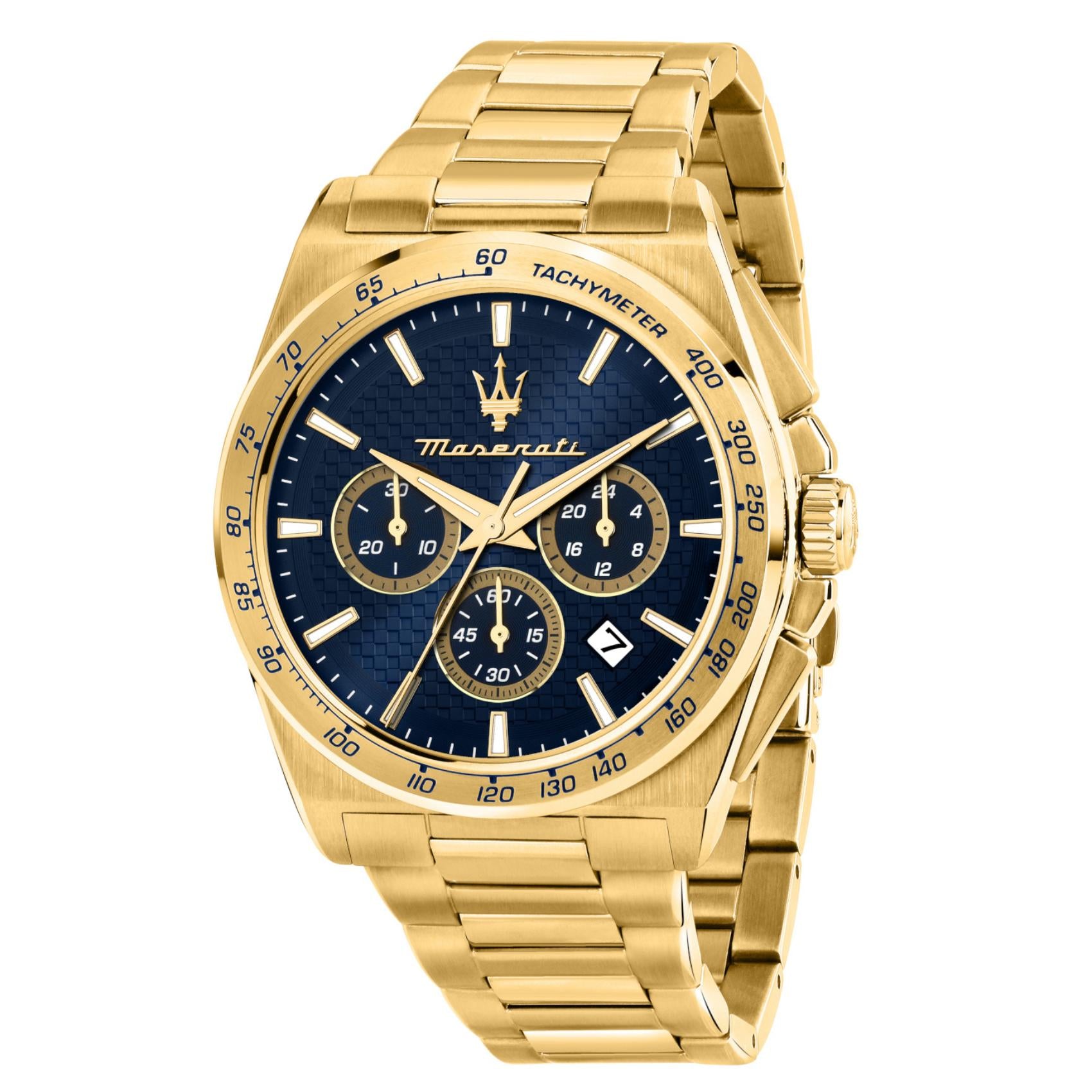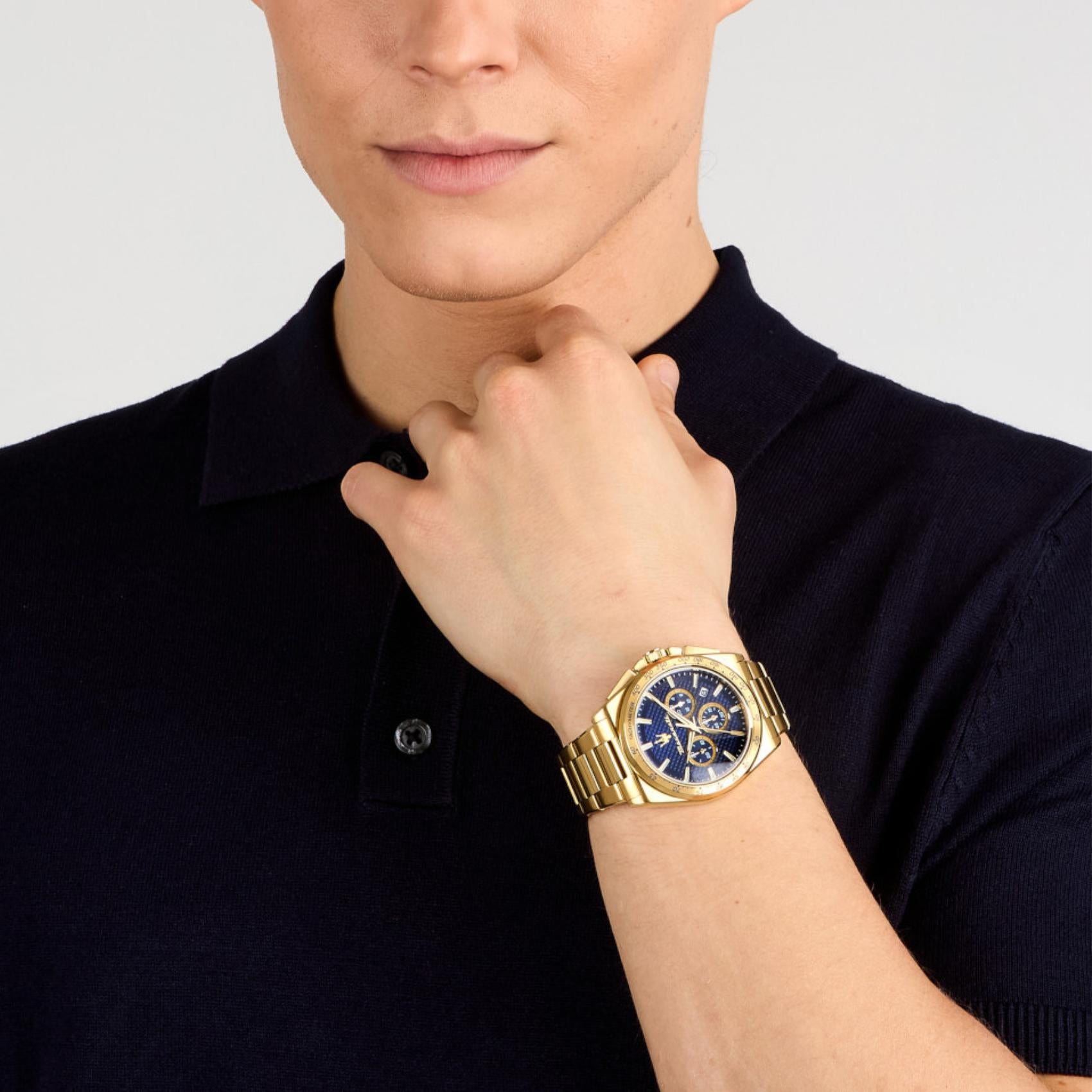 Ανδρικό ρολόι Maserati Velocita R8873652002 χρονογράφος που συνδυάζει χρυσό μπρασελέ από ανοξείδωτο ατσάλι, μπλε καντράν, χρυσούς δείκτες και κάσα διαμέτρου 43mm. Έχει ένδειξη ημερομηνίας, τζαμάκι από ορυκτό κρύσταλλο ειδικής σκλήρυνσης και λειτουργεί με μηχανισμό μπαταρίας Quartz ακριβείας. Το ρολόι είναι αδιάβροχο με στεγανότητα στα 100M/10ΑΤΜ που το καθιστά κατάλληλο για κολύμβηση.