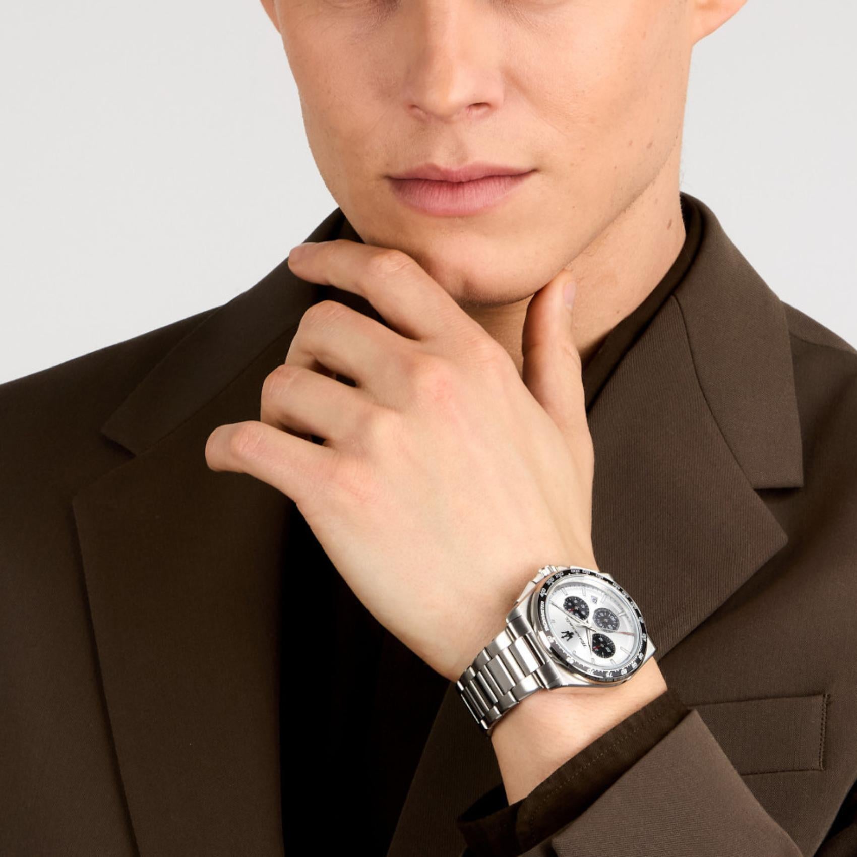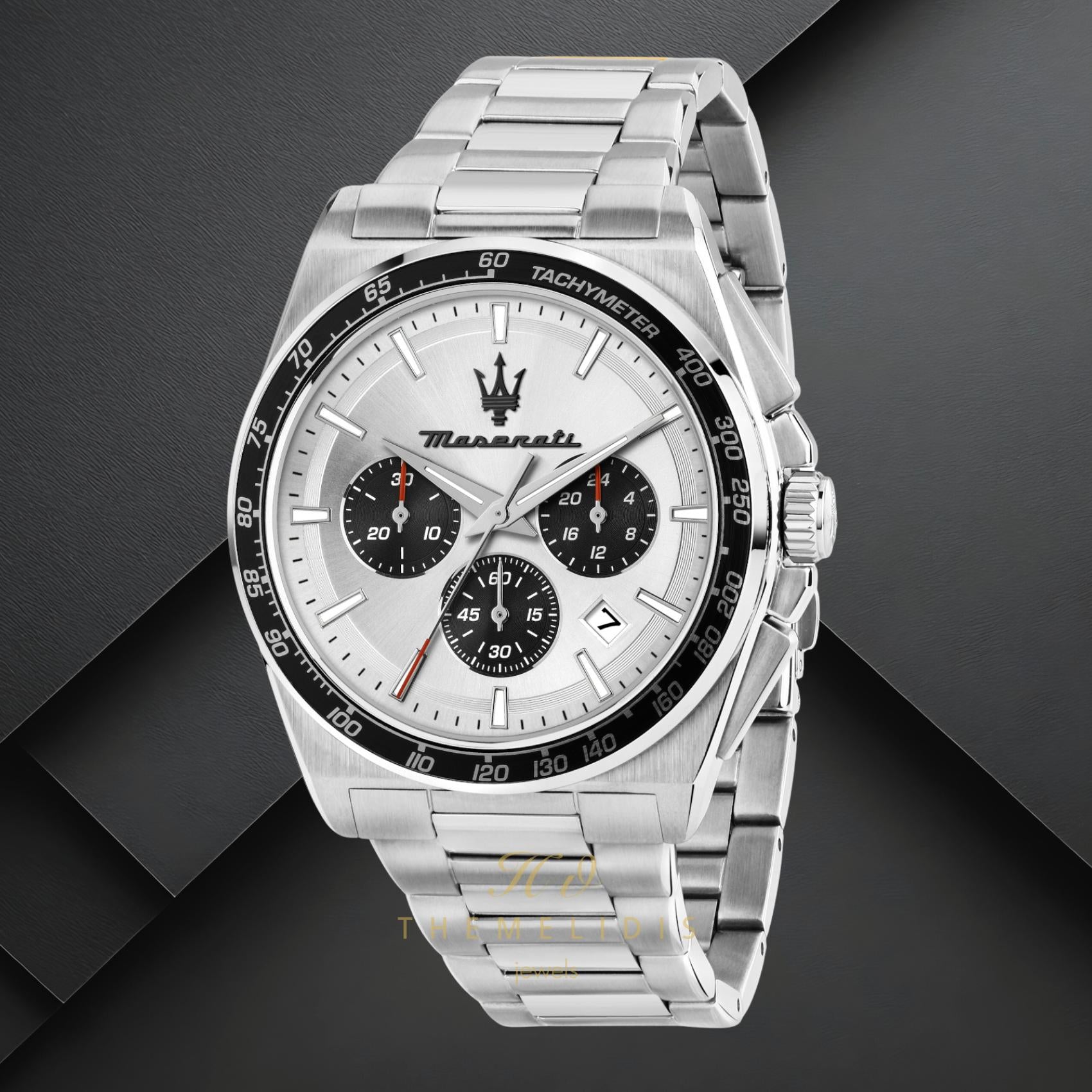 Ανδρικό ρολόι Maserati Velocita R8873652006 χρονογράφος που συνδυάζει ασημί μπρασελέ από ανοξείδωτο ατσάλι, ασημί καντράν, ασημί δείκτες και κάσα διαμέτρου 43mm. Έχει ένδειξη ημερομηνίας, τζαμάκι από ορυκτό κρύσταλλο ειδικής σκλήρυνσης και λειτουργεί με μηχανισμό μπαταρίας Quartz ακριβείας. Το ρολόι είναι αδιάβροχο με στεγανότητα στα 100M/10ΑΤΜ που το καθιστά κατάλληλο για κολύμβηση.