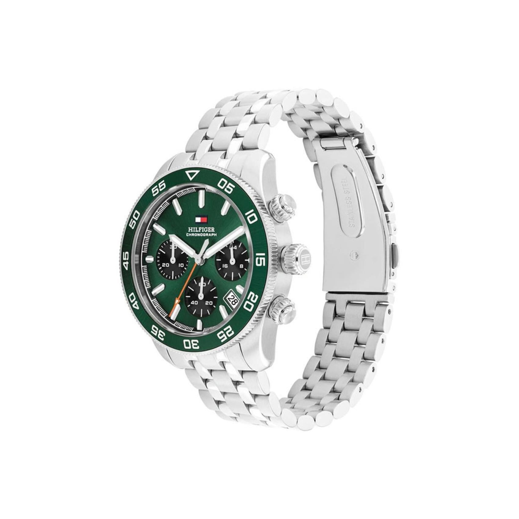 Ανδρικό ρολόι Tommy Hilfiger TH85 1792214 χρονογράφος με ασημί ατσάλινο μπρασελέ και πράσινο καντράν διαμέτρου 41mm. Έχει τζαμάκι από ορυκτό κρύσταλλο ειδικής σκλήρυνσης, μηχανισμό μπαταρίας quartz, ένδειξη ημερομηνίας, ημέρας και διπλής ώρας. Το ρολόι είναι αδιάβροχο με στεγανότητα στα 50M/5ATM που το καθιστά κατάλληλο για κολύμβηση.
