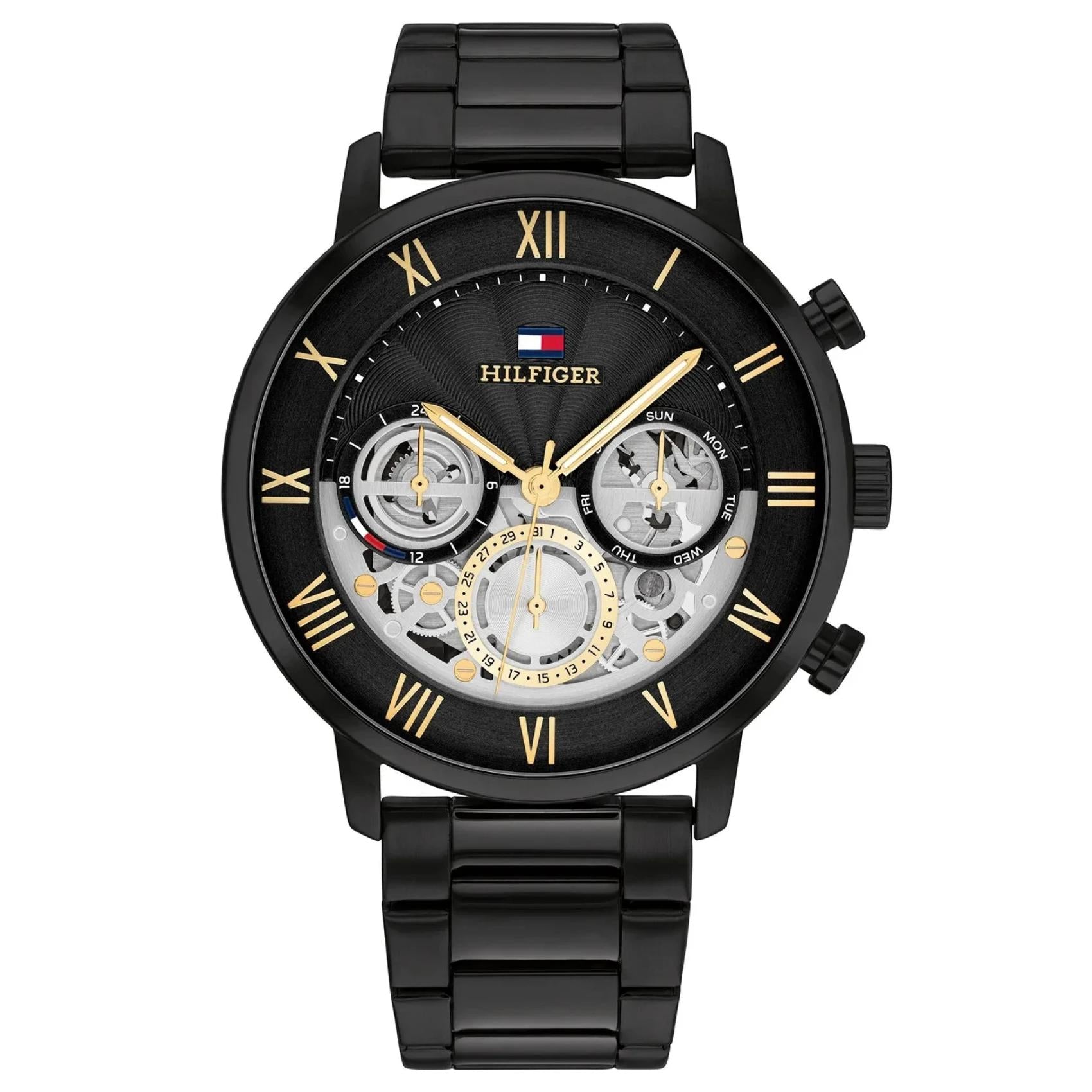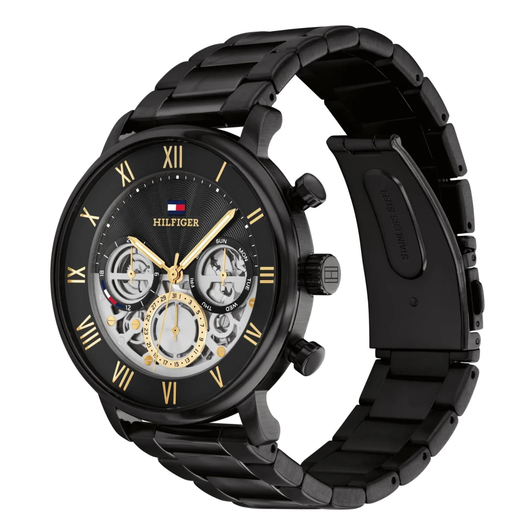 Ανδρικό ρολόι Tommy Hilfiger Legend 1710706 που συνδυάζει μαύρο ατσάλινο μπρασελέ και μαύρο καντράν διαμέτρου 44mm. Έχει τζάμάκι από ορυκτό κρύσταλλο ειδικής σκλήρυνσης, με skeleton μηχανισμό μπαταρίας quartz με ένδειξη ημέρας/ημερομηνίας και είναι αδιάβροχο με στεγανότητα στα 50M/5ΑΤΜ που το καθιστά κατάλληλο για κολύμβηση.