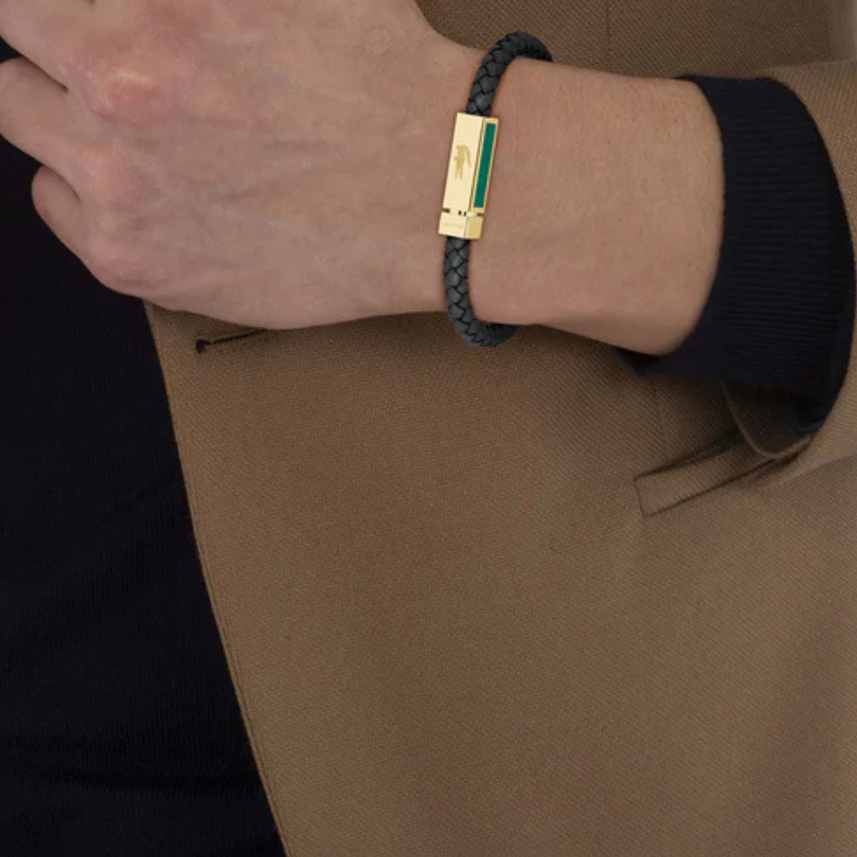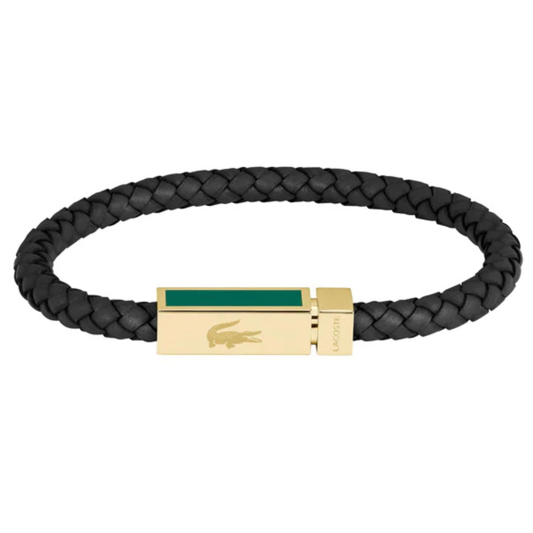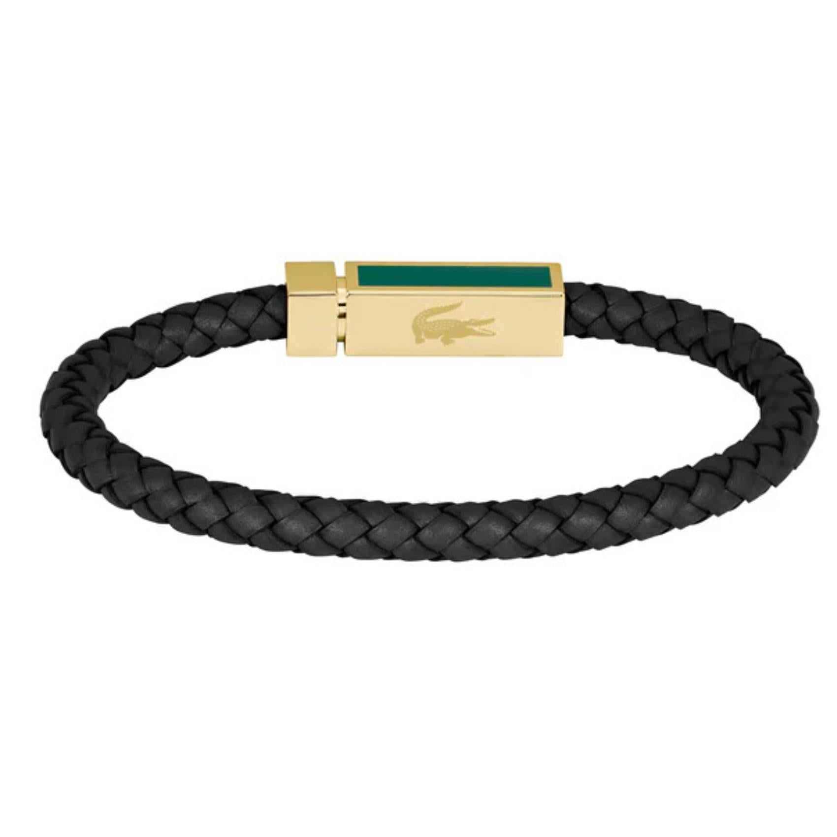 Ανδρικό δερμάτινο βραχιόλι Lacoste 2040318 σε μαύρο χρώμα με πλεκτό σχέδιο. Το μήκος του βραχιολιού είναι στα 19cm και το κούμπωμα είναι κατασκευασμένο από ανοξείδωτο ατσάλι σε χρυσό χρώμα με το λογότυπο της εταιρείας. Το βραχιόλι αποστέλλεται σε συσκευασία δώρου, με πιστοποιητικό γνησιότητας από την επίσημη αντιπροσωπεία της Lacoste.