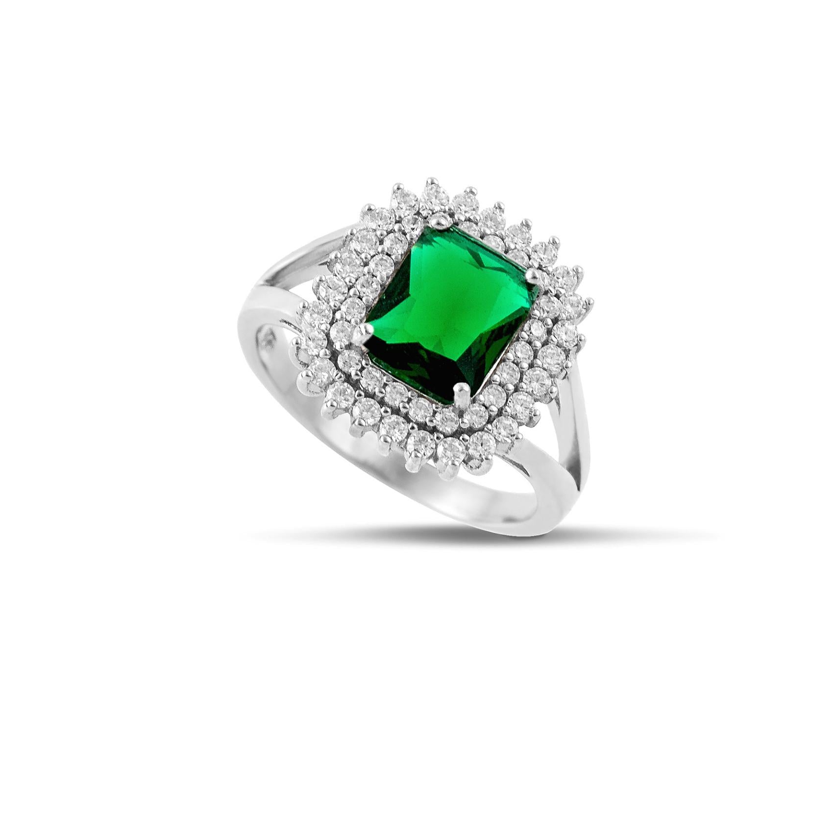 Γυναικείο ασημένιο δαχτυλίδι SRG009 με έντονο χαρακτήρα και καθαρή, high-end αισθητική. Κατασκευασμένο από ασήμι 925, ξεχωρίζει για την ορθογώνια πράσινη κεντρική πέτρα που αναδεικνύεται μέσα από μια διπλή ροζέτα, δημιουργώντας ένα φωτεινό αποτέλεσμα που τραβάει το βλέμμα.