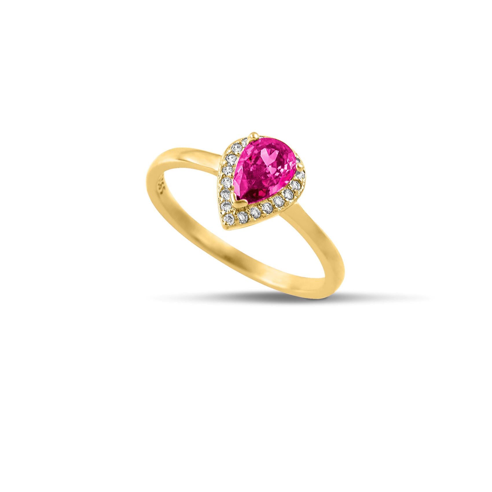 Γυναικείο ασημένιο δαχτυλίδι SRG010 με ροζέτα σε σχήμα δάκρυ σε χρυσό χρώμα, που συνδυάζει ζεστό τόνο μετάλλου με μια έντονη, κομψή χρωματική πινελιά. Κατασκευασμένο από ασήμι 925, διαθέτει κεντρική κόκκινη πέτρα σε κοπή δάκρυ, πλαισιωμένη από λαμπερά ζιργκόν που δημιουργούν φωτεινό περίγραμμα και αναδεικνύουν το σχέδιο με refined αισθητική.