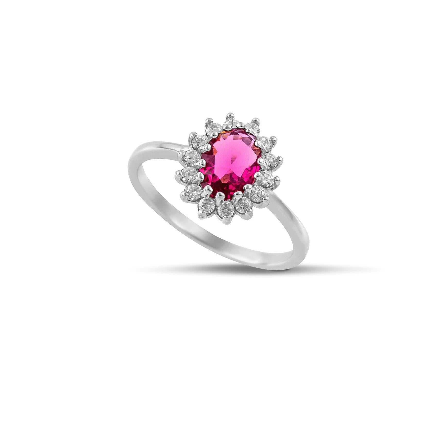 Γυναικείο ασημένιο δαχτυλίδι SRG014 με ροζέτα σε οβάλ σχήμα, που ξεχωρίζει για τον ρομαντικό του χαρακτήρα και τη φωτεινή του λάμψη. Κατασκευασμένο από ασήμι 925, διαθέτει κεντρική κόκκινη οβάλ πέτρα, πλαισιωμένη από λαμπερά ζιργκόν που δημιουργούν ένα κομψό περίγραμμα και αναδεικνύουν το σχέδιο με refined αισθητική.