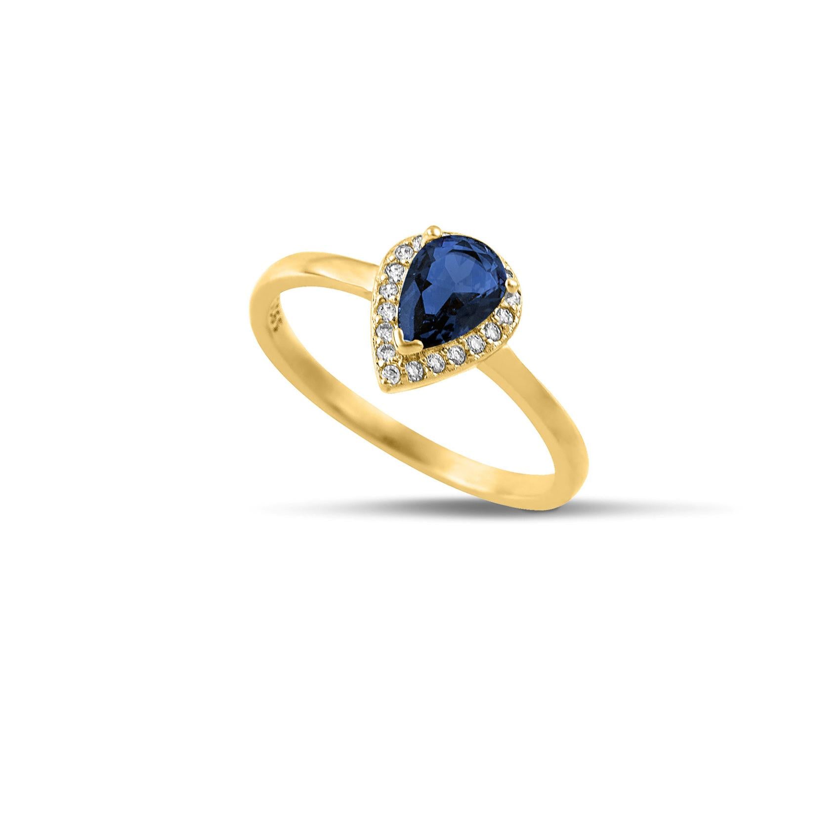 Γυναικείο ασημένιο δαχτυλίδι SRG015 με ροζέτα σε σχήμα δάκρυ σε χρυσό χρώμα, που συνδυάζει ζεστό τόνο μετάλλου με μια κομψή, βαθιά χρωματική πινελιά. Κατασκευασμένο από ασήμι 925, διαθέτει κεντρική μπλε πέτρα σε κοπή δάκρυ, πλαισιωμένη από λαμπερά ζιργκόν που δημιουργούν φωτεινό περίγραμμα και αναδεικνύουν το σχέδιο με refined αισθητική.