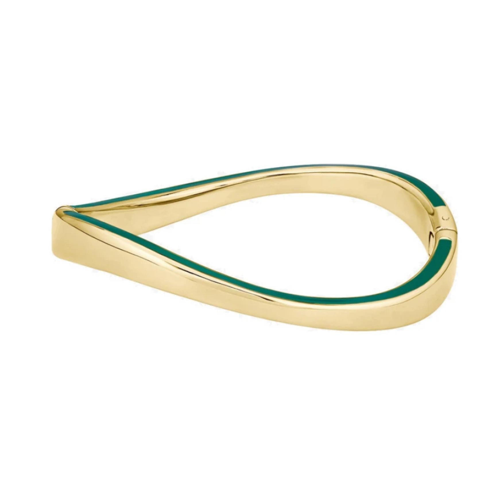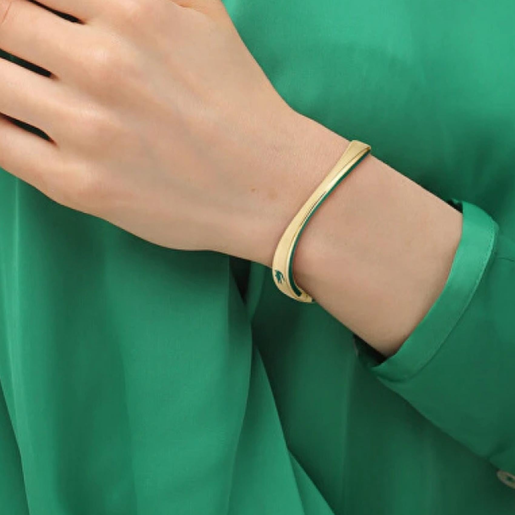 Γυναικεία χειροπέδα βραχιόλι Lacoste 2040543 σε χρυσό χρώμα από ανοξείδωτο ατσάλι διακοσμημένο με πράσινο σμάλτο. Το μέγιστο μήκος του βραχιολιού είναι στα 22cm και αποστέλλεται σε συσκευασία δώρου, με πιστοποιητικό γνησιότητας από την επίσημη αντιπροσωπεία της Lacoste.