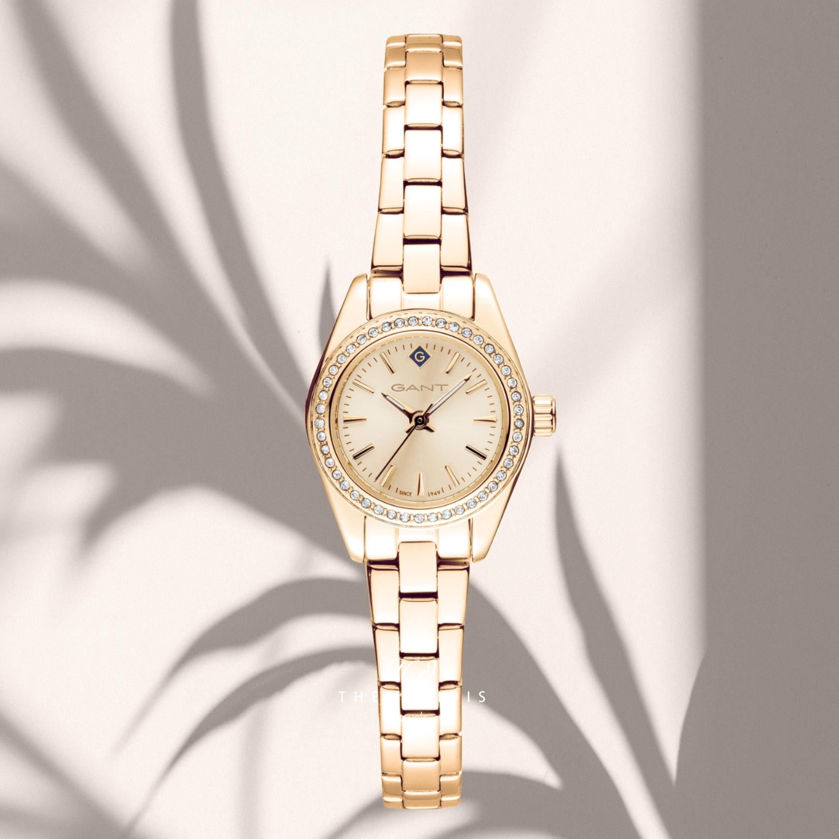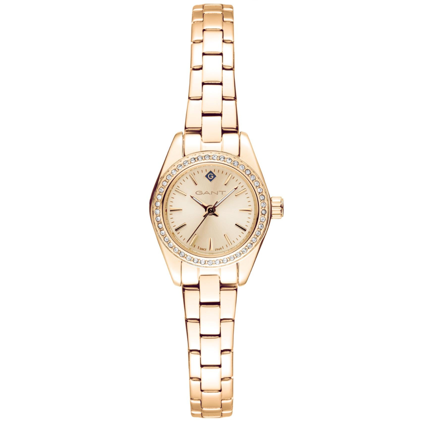 Ρολόι Gant Fairhaven Bijou G194104 με ατσάλινο μπρασελέ σε χρυσό χρώμα και χρυσό καντράν διαμέτρου 22mm διακοσμημένο με ζιργκόν. Λειτουργεί με μηχανισμό μπαταρίας και είναι αδιάβροχο με στεγανότητα στα 5ATM-50Μ που το καθιστά κατάλληλο για κολύμβηση.