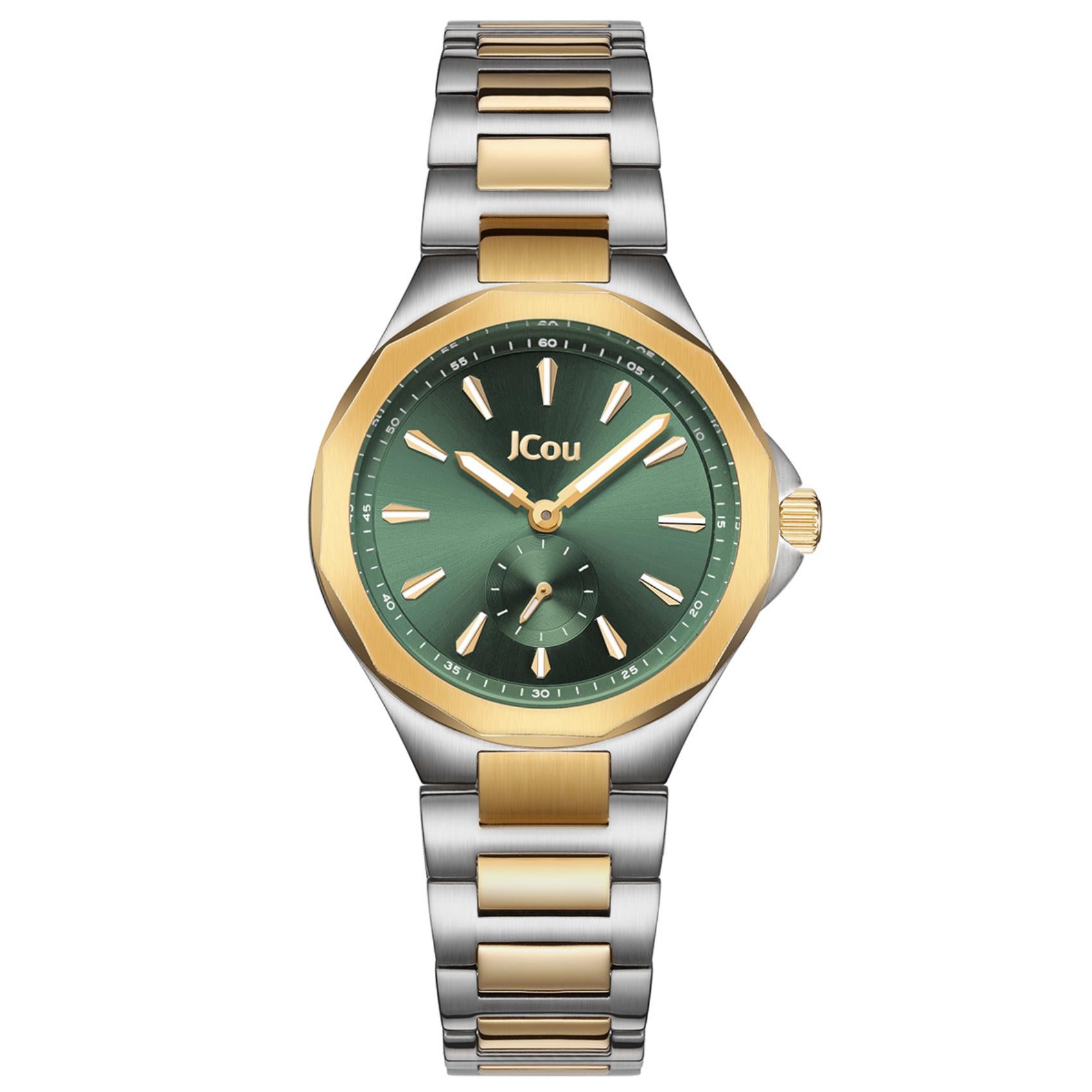Γυναικείο ρολόι JCOU Aurelia JU19078-2 με ασημί και χρυσό ατσάλινο μπρασελέ και πράσινο καντράν διαμέτρου 32mm, με ένδειξη δευτερολεπτών. Έχει τζάμάκι από ορυκτό κρύσταλλο ειδικής σκλήρυνσης, λειτουργεί με μηχανισμό μπαταρίας quartz, ενώ είναι αδιάβροχο με στεγανότητα στα 100M/10ΑΤΜ που το καθιστά κατάλληλο για κολύμβηση.