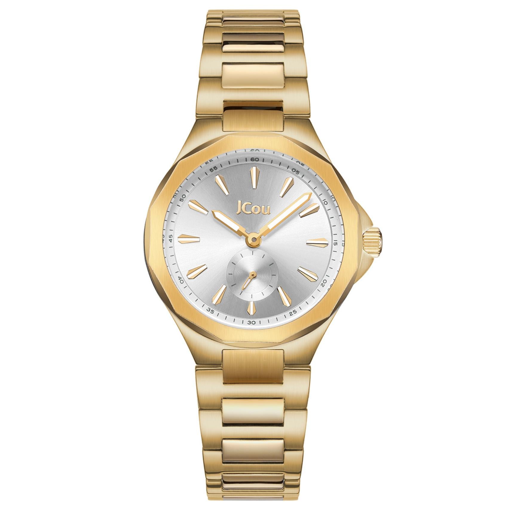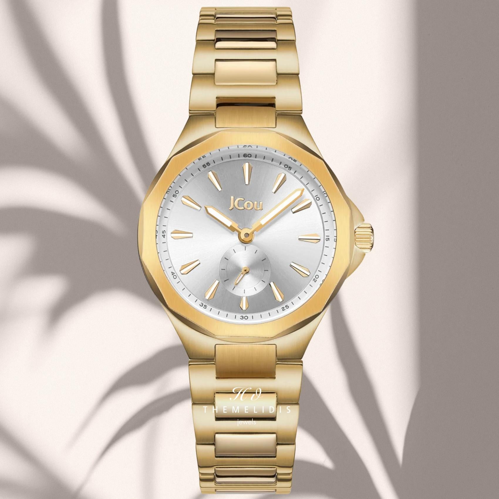 Γυναικείο ρολόι JCOU Aurelia JU19078-3 με χρυσό ατσάλινο μπρασελέ και ασημί καντράν διαμέτρου 32mm και με ένδειξη δευτερολεπτών. Έχει τζάμάκι από ορυκτό κρύσταλλο ειδικής σκλήρυνσης, λειτουργεί με μηχανισμό μπαταρίας quartz, ενώ είναι αδιάβροχο με στεγανότητα στα 100M/10ΑΤΜ που το καθιστά κατάλληλο για κολύμβηση.