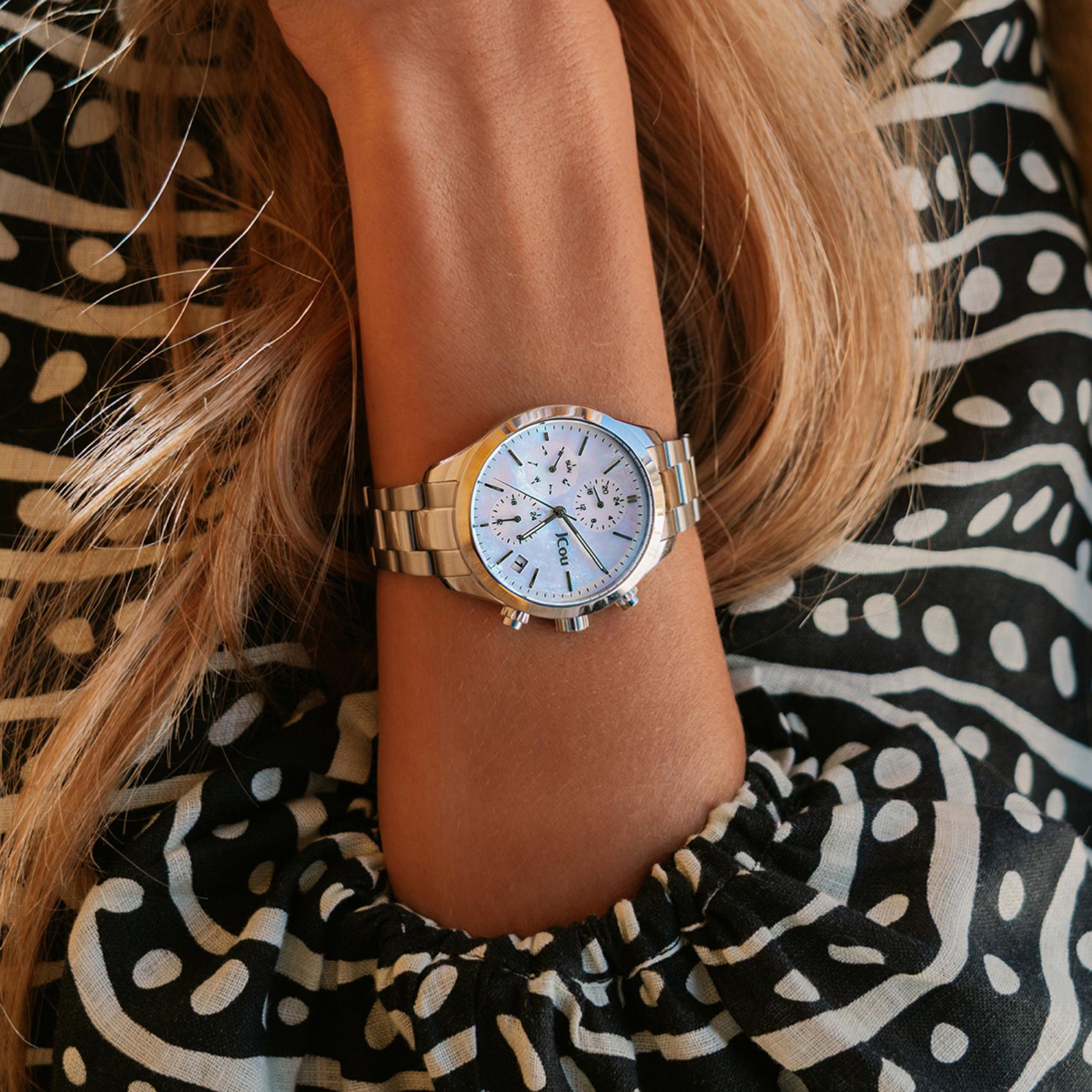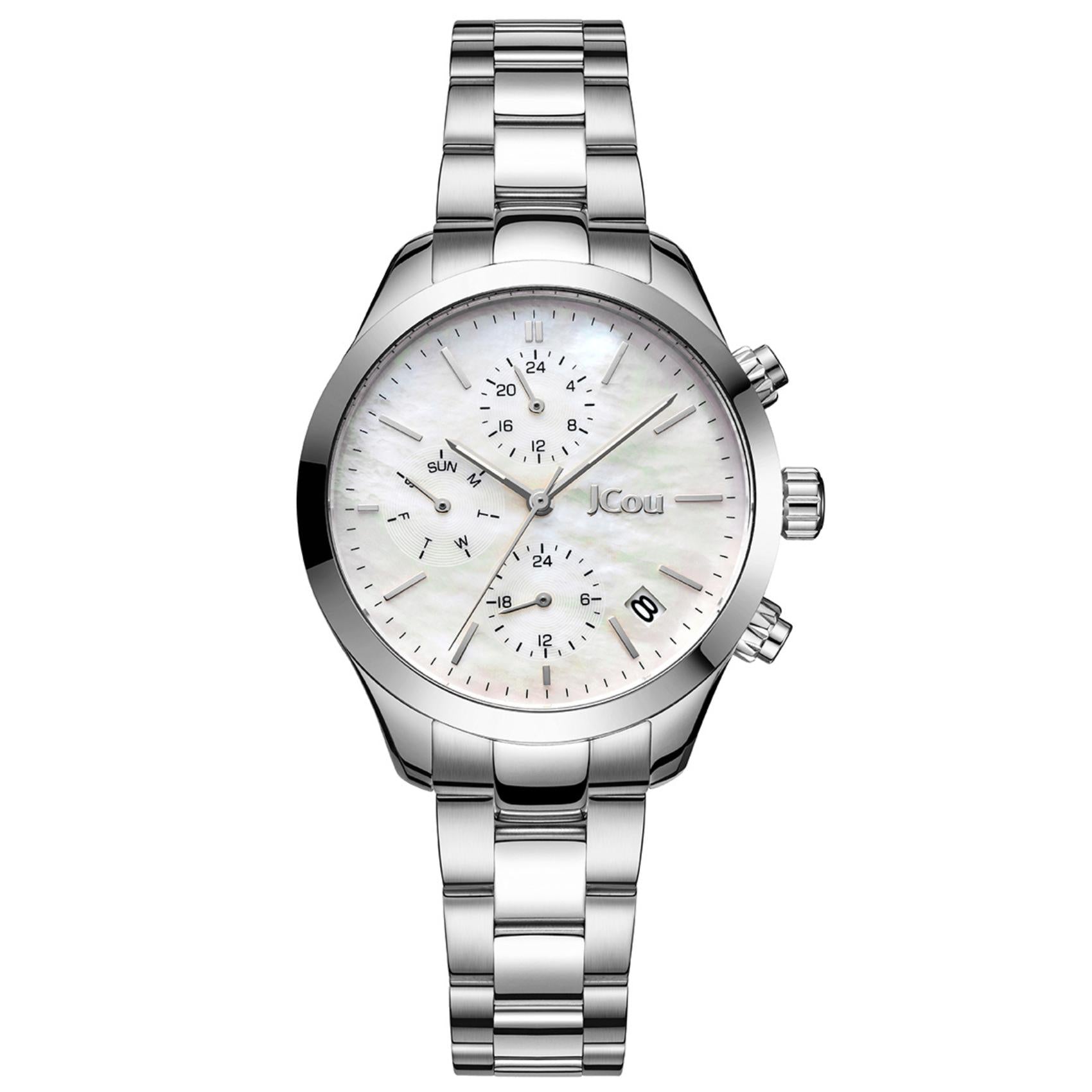 Το γυναικείο ρολόι JCOU Aurora JU19081-1 συνδυάζει ασημί μπρασελέ από ανοξείδωτο ατσάλι, λευκό φίλντισι καντράν με ασημένιους δείκτες και κάσα διαμέτρου 36mm. Διαθέτει τζάμάκι από ορυκτό κρύσταλλο ειδικής σκλήρυνσης, μηχανισμό μπαταρίας quartz με ένδειξη ημέρας, διπλής ώρας και λειτουργία χρονογράφου. Είναι αδιάβροχο με στεγανότητα στα 100M/10ΑΤΜ που το καθιστά κατάλληλο για κολύμβηση.