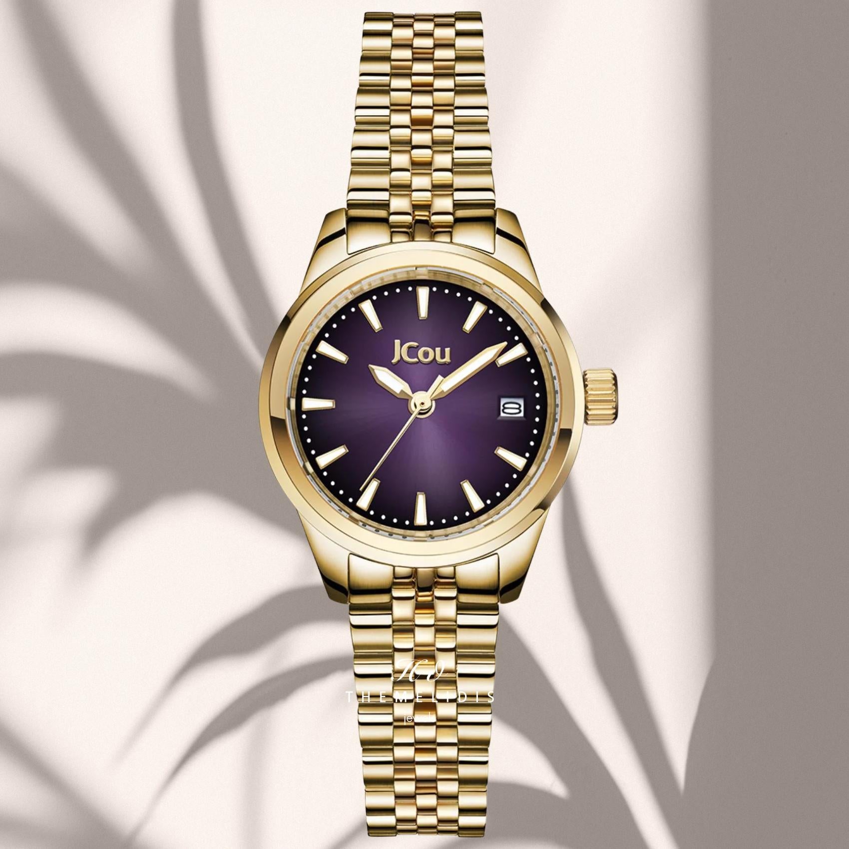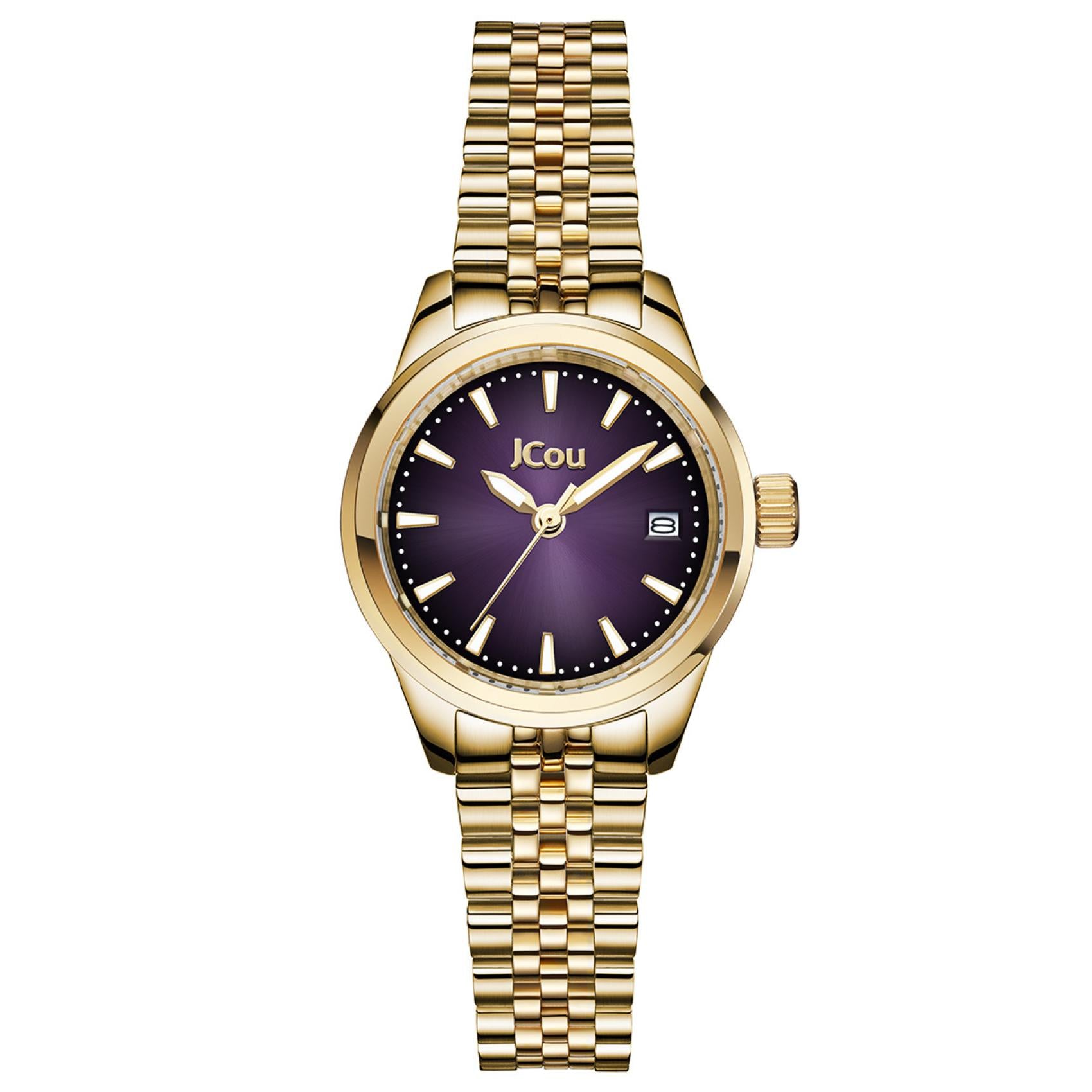 Γυναικείο ρολόι JCOU Calisti JU19079-6 με χρυσό ατσάλινο μπρασελέ και μωβ καντράν διαμέτρου 25mm. Διαθέτει τζάμάκι από ορυκτό κρύσταλλο ειδικής σκλήρυνσης, μηχανισμό μπαταρίας quartz με ένδειξη ημερομηνίας και είναι αδιάβροχο με στεγανότητα στα 100M/10ΑΤΜ που το καθιστά κατάλληλο για κολύμβηση.