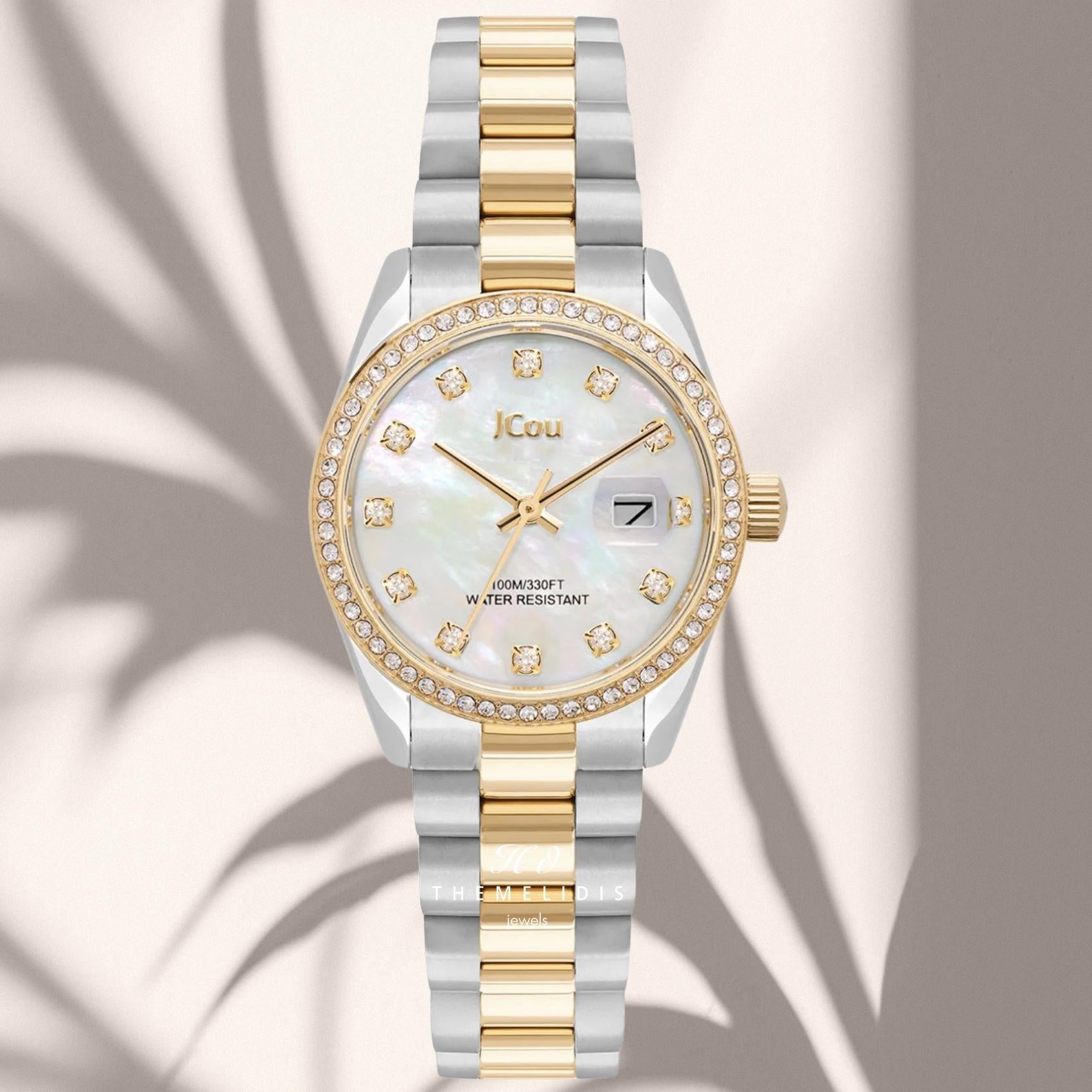 Γυναικείο ρολόι JCOU Iris JU19082-2 με χρυσό και ασημί ατσάλινο μπρασελέ και λευκό φίλντισι καντράν διαμέτρου 29mm, διακοσμημένο με λαμπερά ζιργκόν. Έχει τζάμάκι από ορυκτό κρύσταλλο ειδικής σκλήρυνσης, λειτουργεί με μηχανισμό μπαταρίας quartz και διαθέτει ένδειξη ημερομηνίας, ενώ είναι αδιάβροχο με στεγανότητα στα 100M/10ΑΤΜ που το καθιστά κατάλληλο για κολύμβηση.