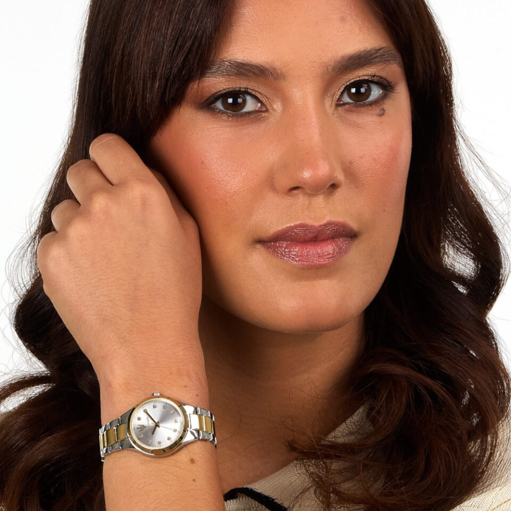 Γυναικείο ρολόι Maserati Attrazione R8853151505 που συνδυάζει δίχρωμο μπρασελέ ασημί και χρυσό από ανοξείδωτο ατσάλι και ασημί καντράν, χρυσούς δείκτες και δίχρωμη κάσα διαμέτρου 30mm. Έχει τζαμάκι από ορυκτό κρύσταλλο ειδικής σκλήρυνσης και μηχανισμό μπαταρίας quartz. Το ρολόι είναι αδιάβροχο με στεγανότητα στα 50M/5ΑΤΜ που το καθιστά κατάλληλο για κολύμβηση.