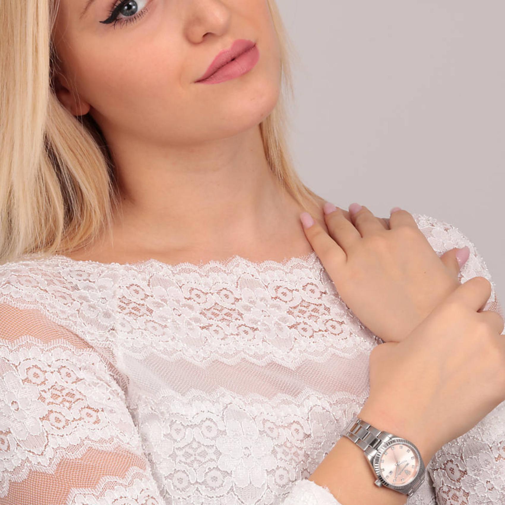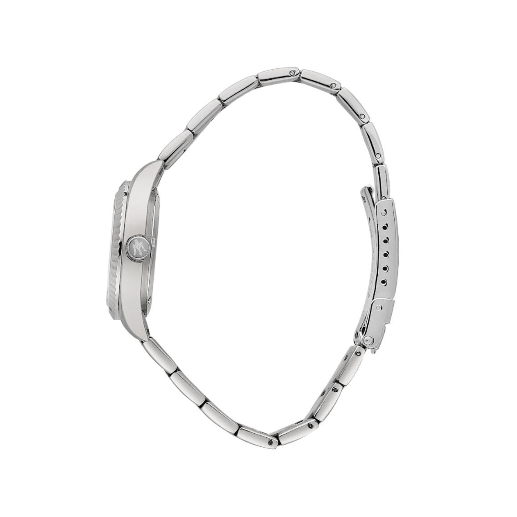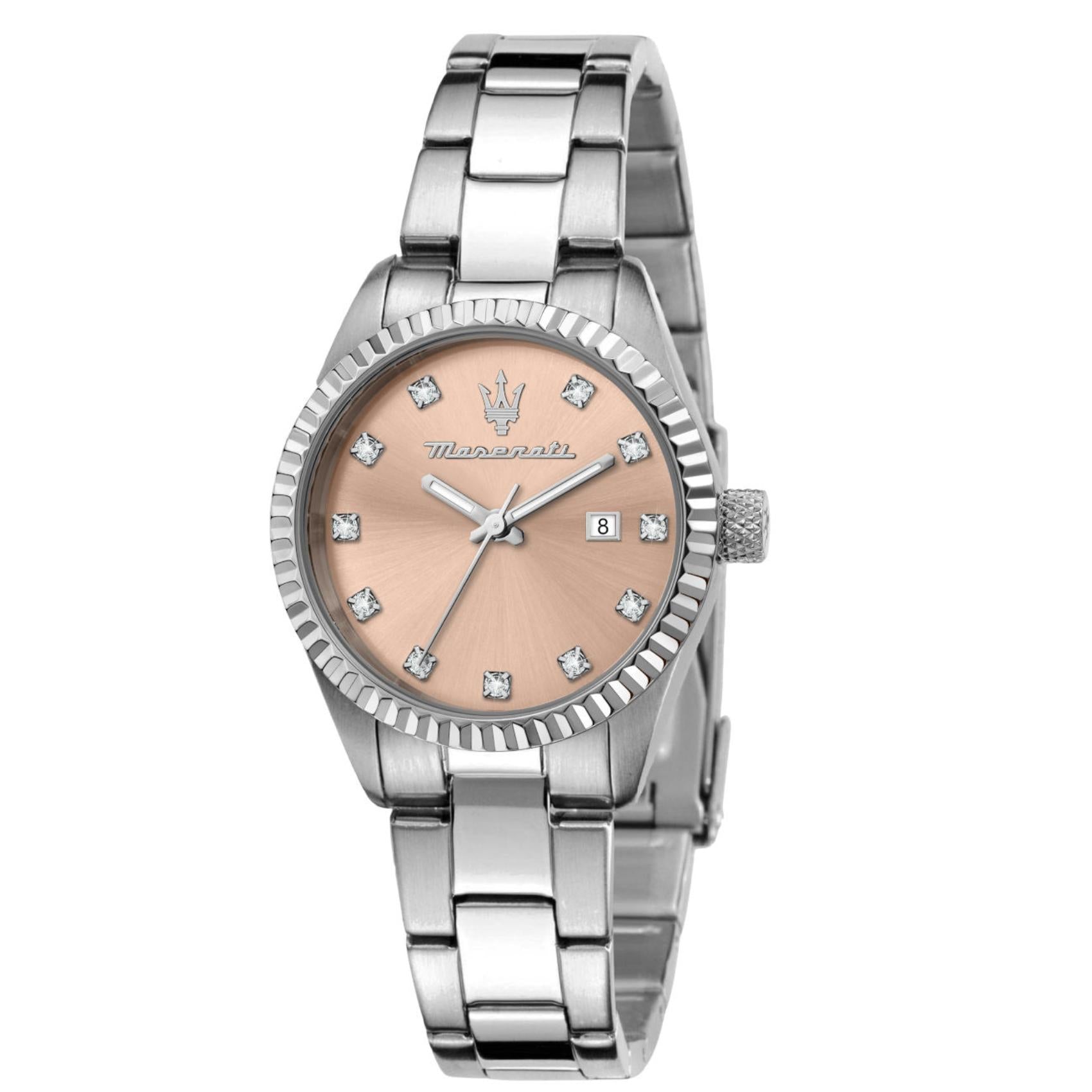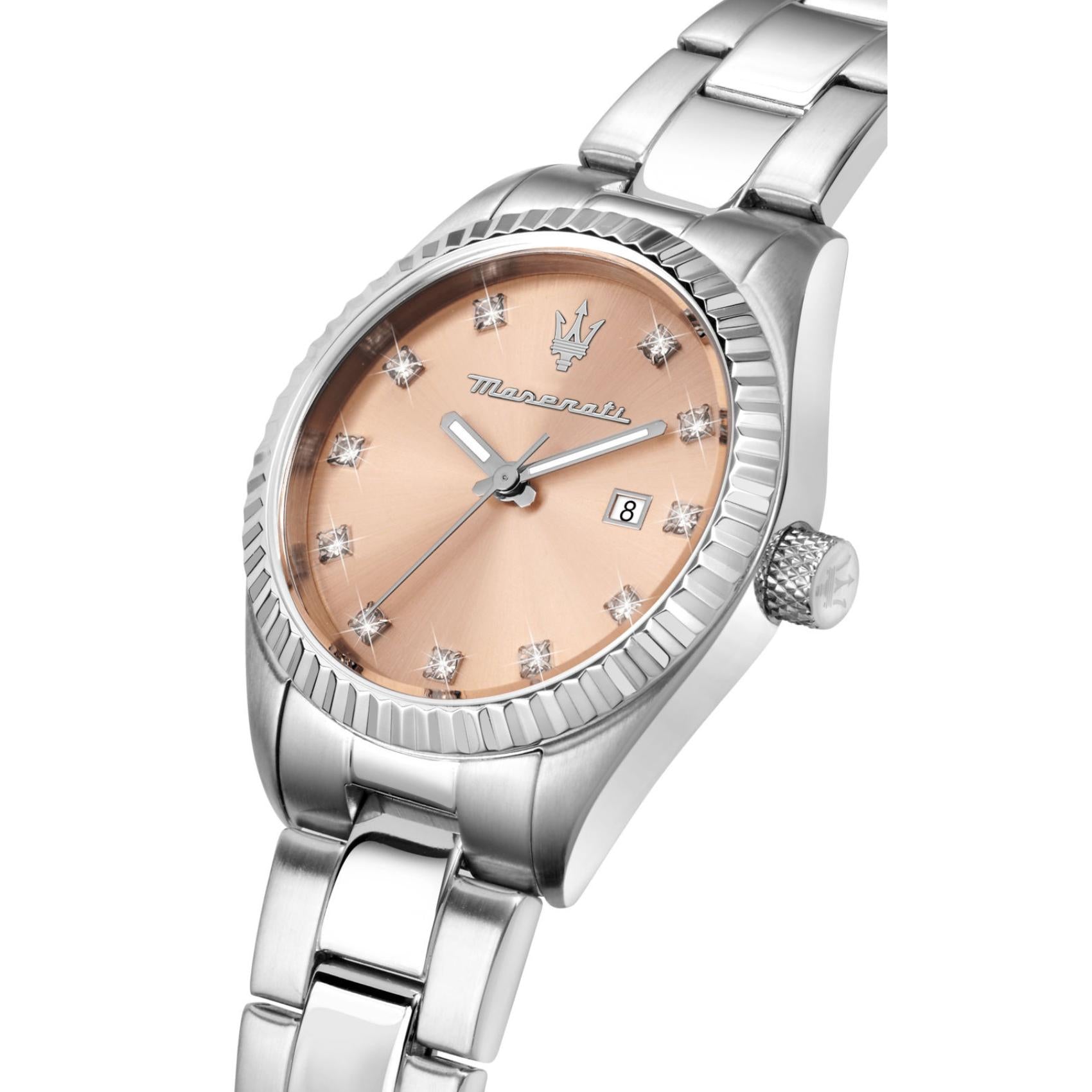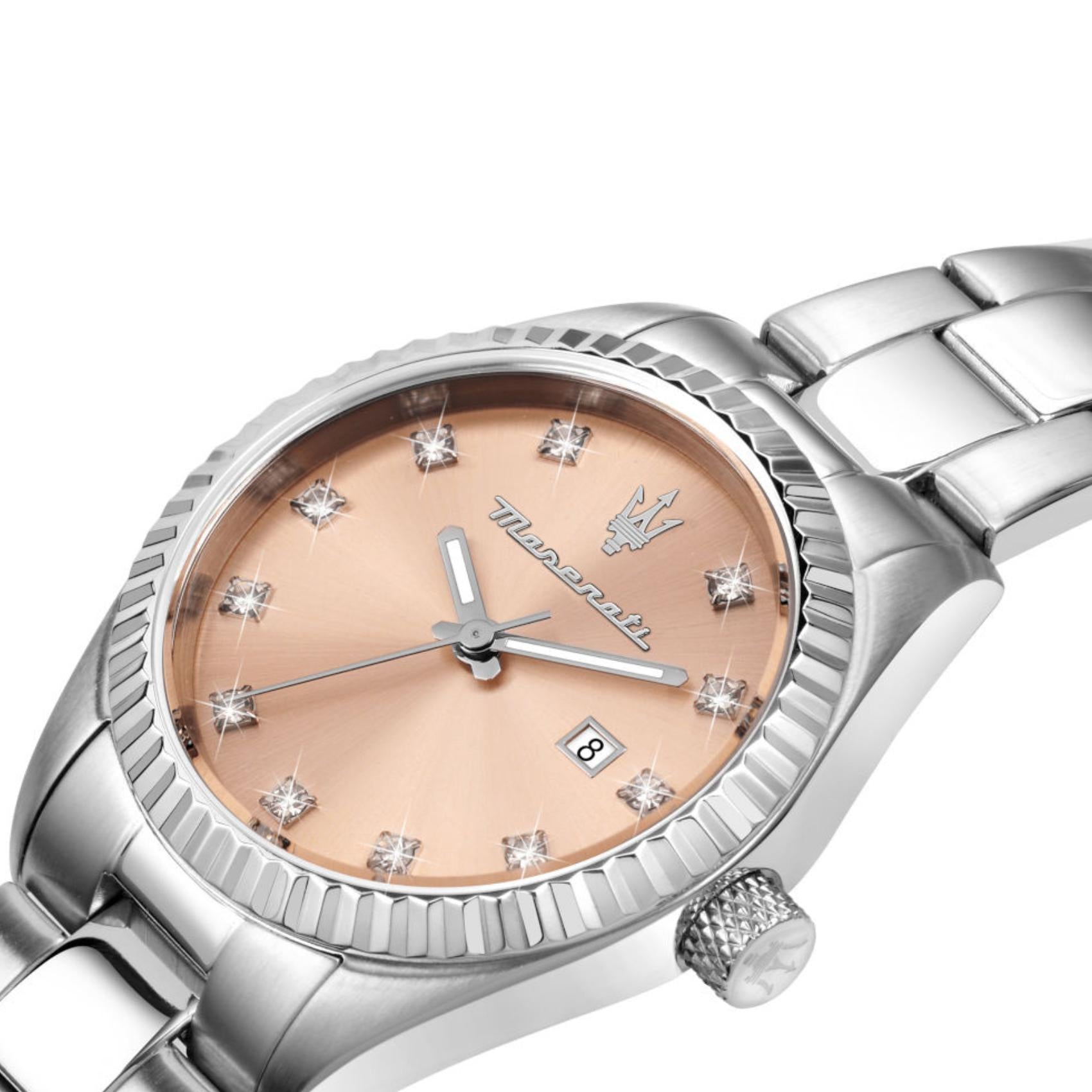 Γυναικείο ρολόι Maserati Competizione R8853100509 που συνδυάζει ασημί μπρασελέ από ανοξείδωτο ατσάλι, ροζ καντράν διακοσμημένο με ζιργκόν, ασημένιους δείκτες. και κάσα με διάμετρο 31mm. Το ρολόι έχει τζάμάκι από ορυκτό κρύσταλλο ειδικής σκλήρυνσης, μηχανισμό μπαταρίας quartz, ένδειξη ημέρομηνίας και είναι αδιάβροχο με στεγανότητα στα 100M/10ΑΤΜ που το καθιστά κατάλληλο για κολύμβηση.
