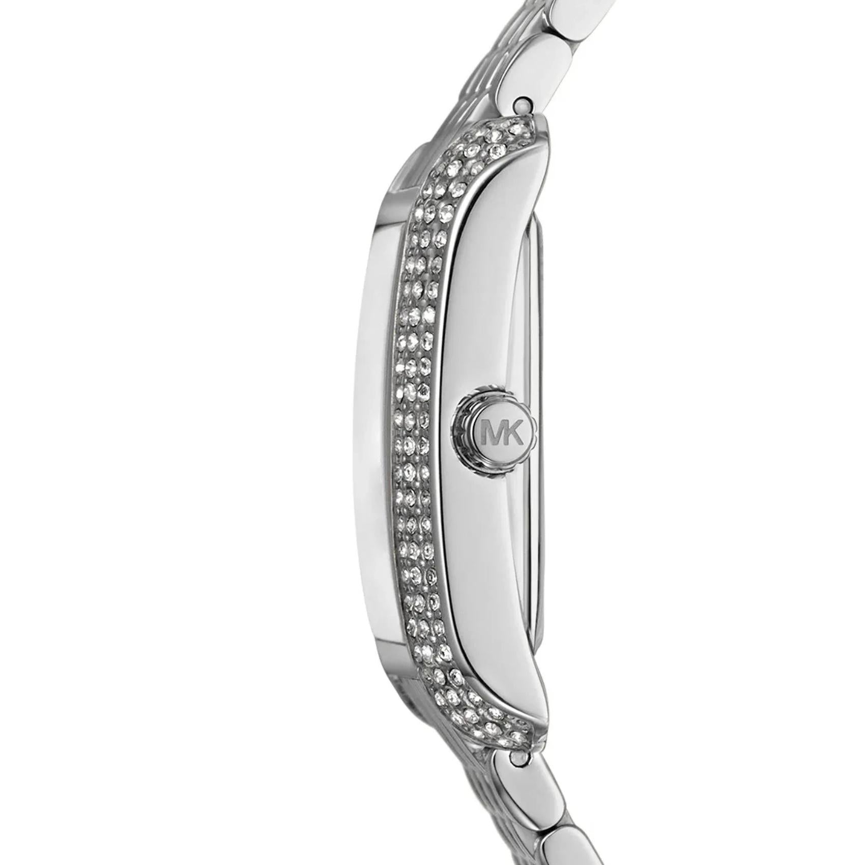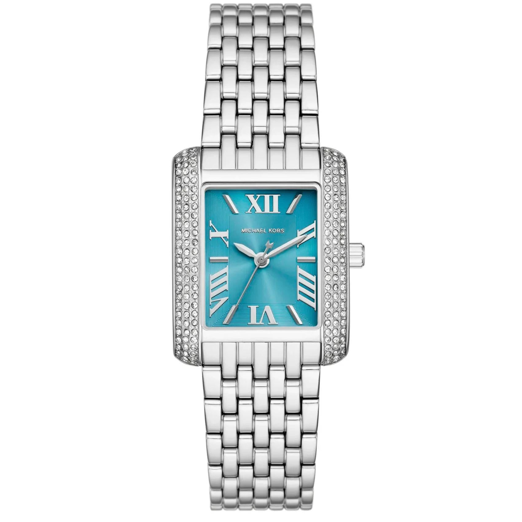 Γυναικείο ρολόι Michael Κors Emery MK4829 με ασημί ατσάλινο μπρασελέ και μπλε τετράγωνο καντράν μεγέθους 27mm διακοσμημένο με λαμπερά ζιργκόν. Λειτουργεί με μηχανισμό μπαταρίας quartz ενώ είναι αδιάβροχο με στεγανότητα 5ATM-50Μ που το καθιστά κατάλληλο για κολύμβηση.