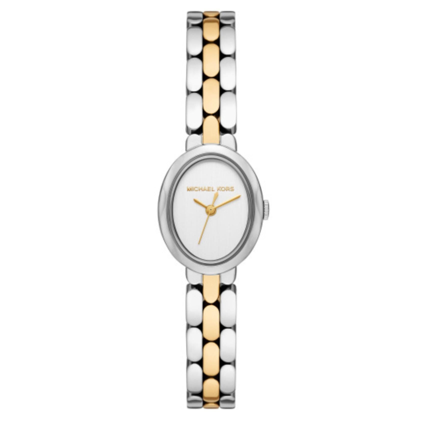 Γυναικείο ρολόι Michael Kors Maude MK4956 με δίχρωμο μπρασελέ σε ασημί και χρυσό χρώμα από ανοξείδωτο ατσάλι, λευκό κάντραν διαμέτρου 21mm, ασημί κάσα και δείκτες σε χρυσό χρώμα. Λειτουργεί με μηχανισμό μπαταρίας quartz και έχει στεγανότητα 3ATM-30Μ που το καθιστά κατάλληλο για απλή επαφή με το νερό.